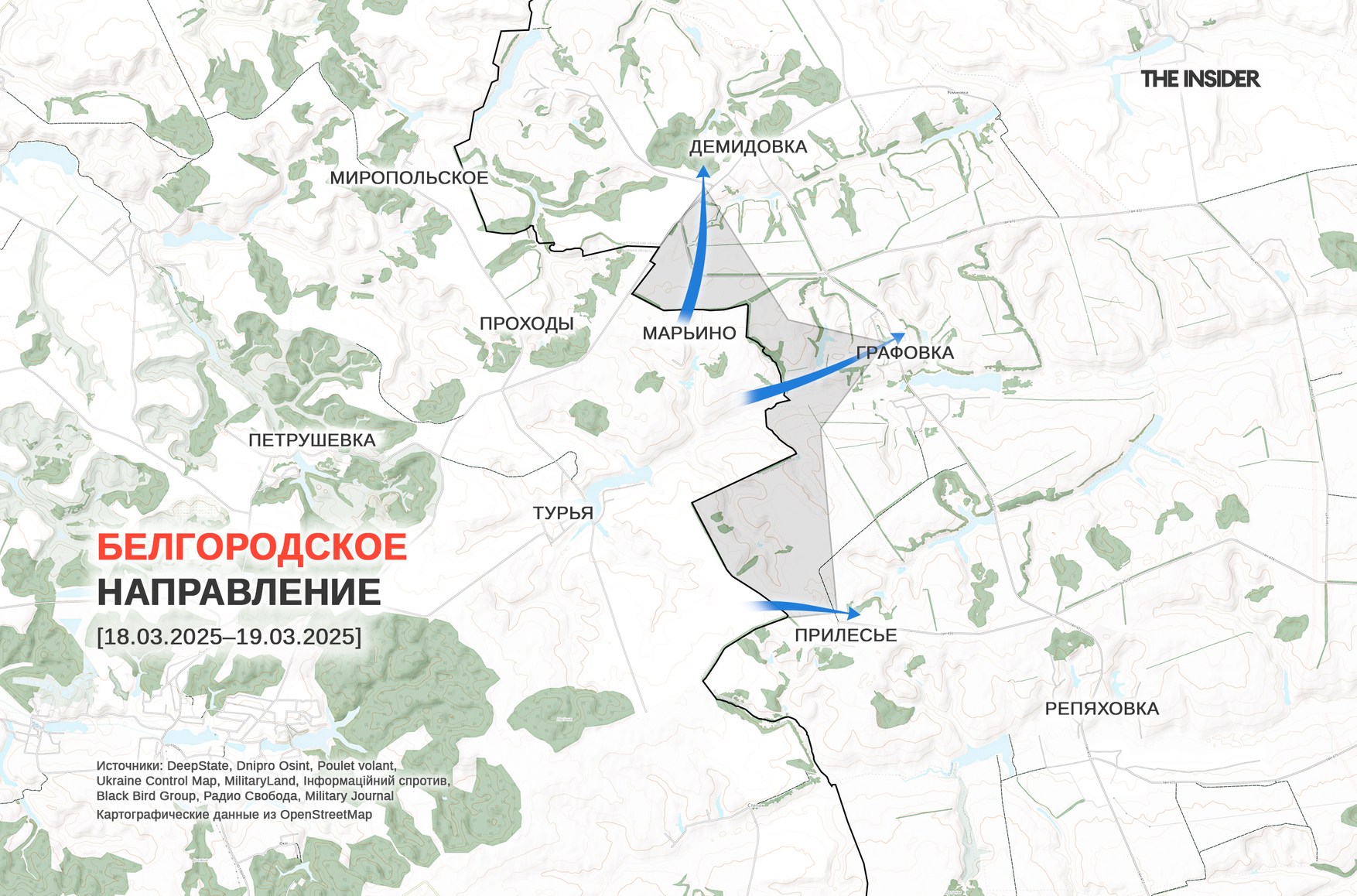 По информации «военкора» Андрея Филатова, украинские войска к утру 19 марта вышли на рубеж Графовка — Демидовка (примерно в 2 км от границы), а также подтянули расчеты FPV-дронов и гаубиц M777 для обстрелов райцентра Красная Яруга. В Telegram-канале «АРХАНГЕЛ СПЕЦНАЗА» уверяют, что ВСУ не дошли до Демидовки — «сидят за нулем в двух лесополосах, идут бои». Авторы «Рыбаря» тоже признают присутствие украинских военных в нескольких «посадках» на российской территории.