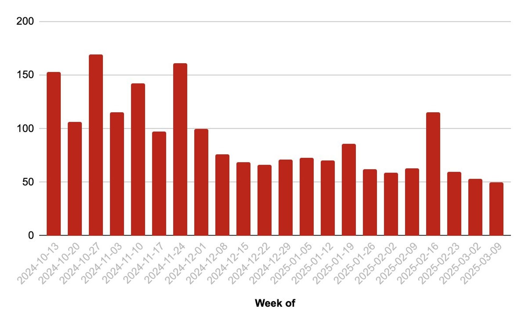 Визуально подтвержденные потери российской техники и вооружений по неделям с октября 2024 года
