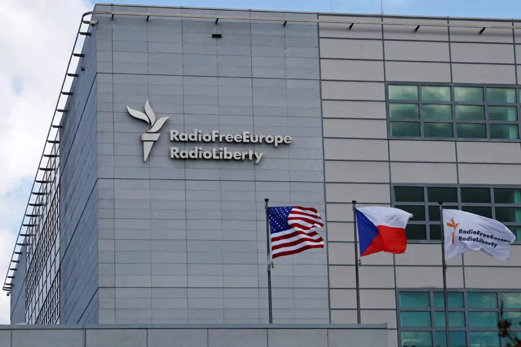 A sign and flags are shown at the headquarters of Radio Free Europe/Radio Liberty in Prague, Czech Republic, March 17, 2025. REUTERS/David W Cerny