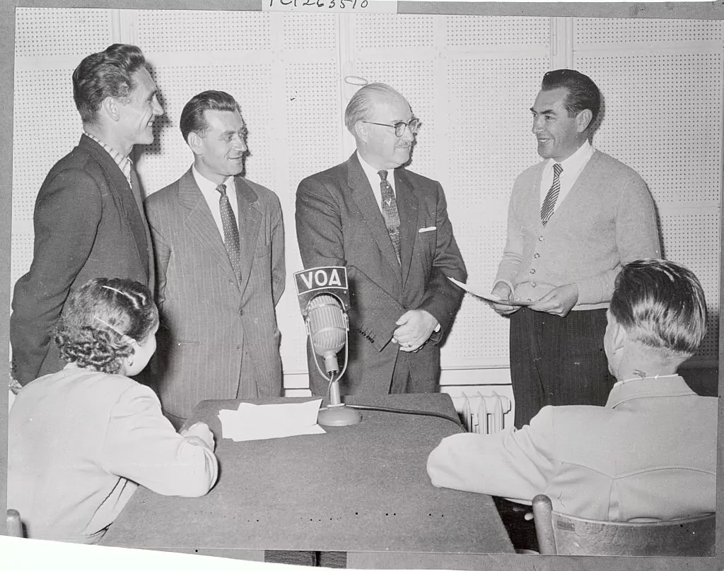 Представитель Калифорнии Чет Холлифилд (в центре, в очках) беседует с группой недавних беглецов из-за железного занавеса в студии радиостанции «Голос Америки» в Мюнхене, 1954 год. Фото: Bettmann / Getty Images