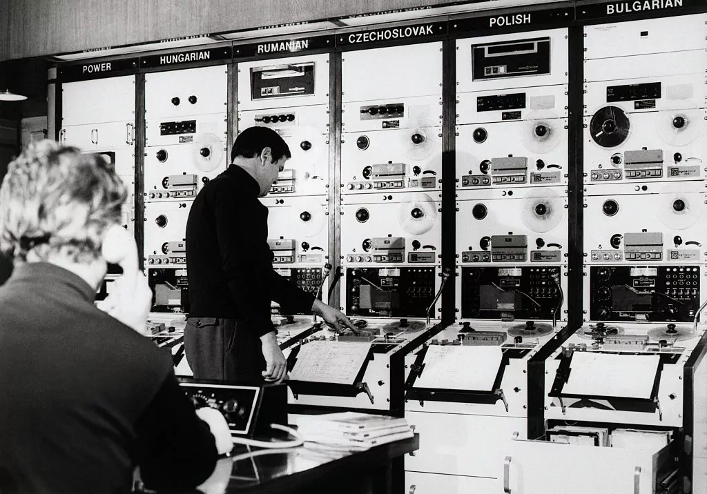 Главный диспетчерский пункт радиостанции «Свободная Европа» в Мюнхене, 1972 год. Фото: Bettmann / Getty Images