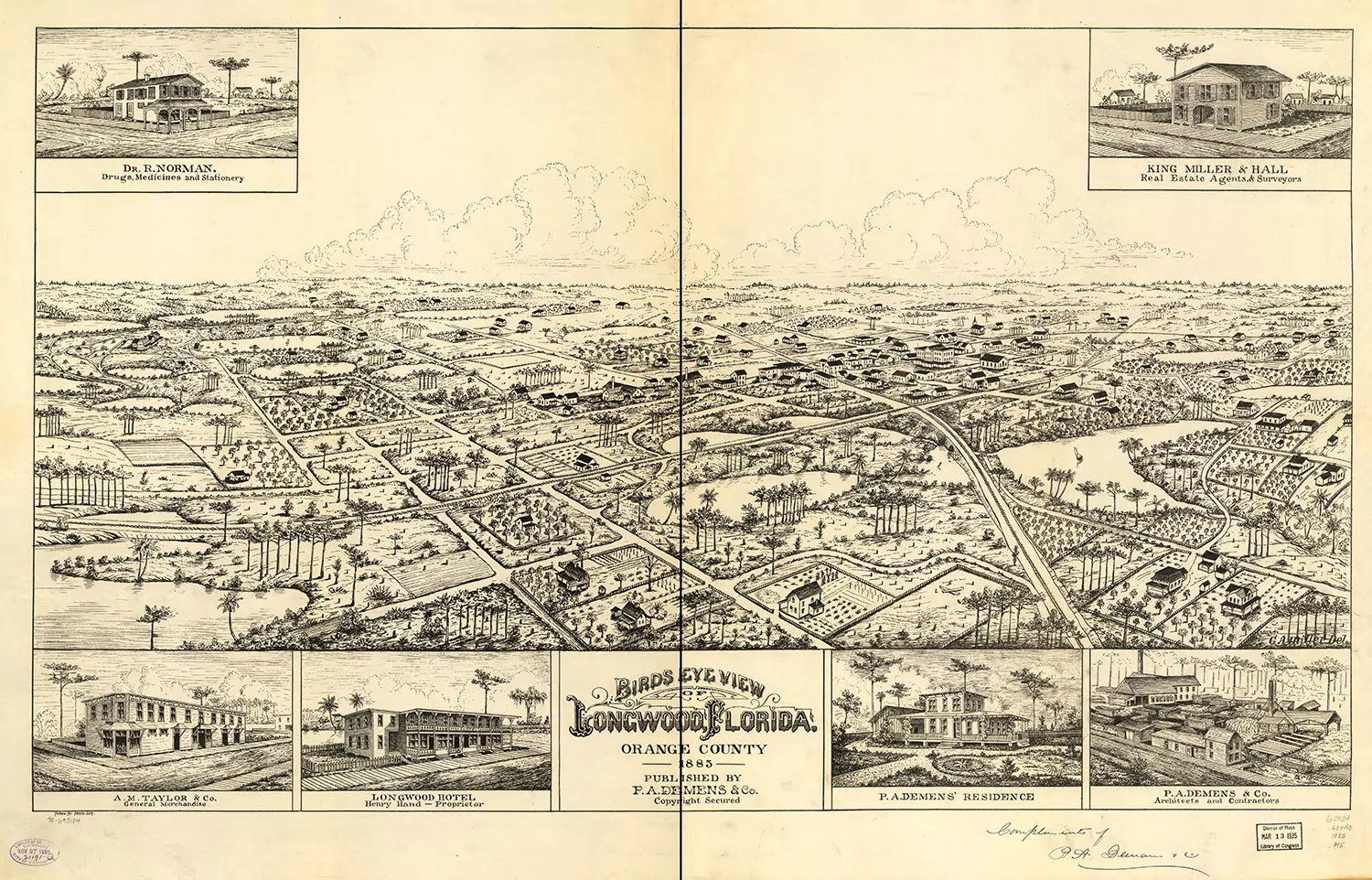 Вид на Лонгвуд, Флорида, округ Ориндж, с высоты птичьего полета. 1885 год. Справа в нижнем ряду: резиденция и лесопилка Питера Деменса. Иллюстрация: P.A. Demens & Co / Библиотека Конгресса США