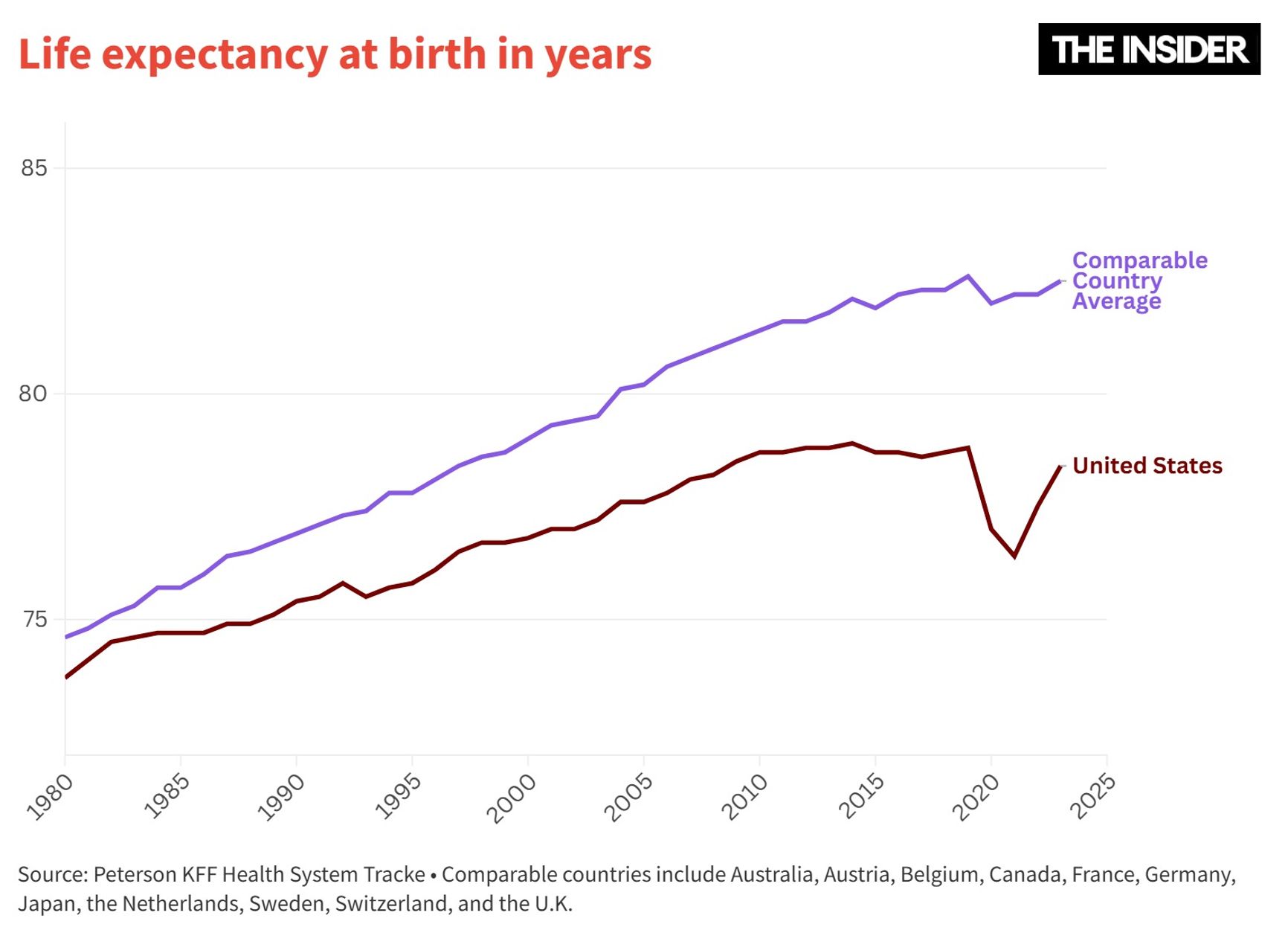 The United States is the richest country in the world, but far from the healthiest. Over the past 40 years, the U.S. has fallen far behind other developed nations in life expectancy. In 1980, the gap was less than a year (73.7 vs. 74.6), but by the early 2020s, it had widened to more than four years (78.4 vs. 82.5). Despite having the highest healthcare spending among developed countries, the U.S. has the lowest life expectancy for both men and women.