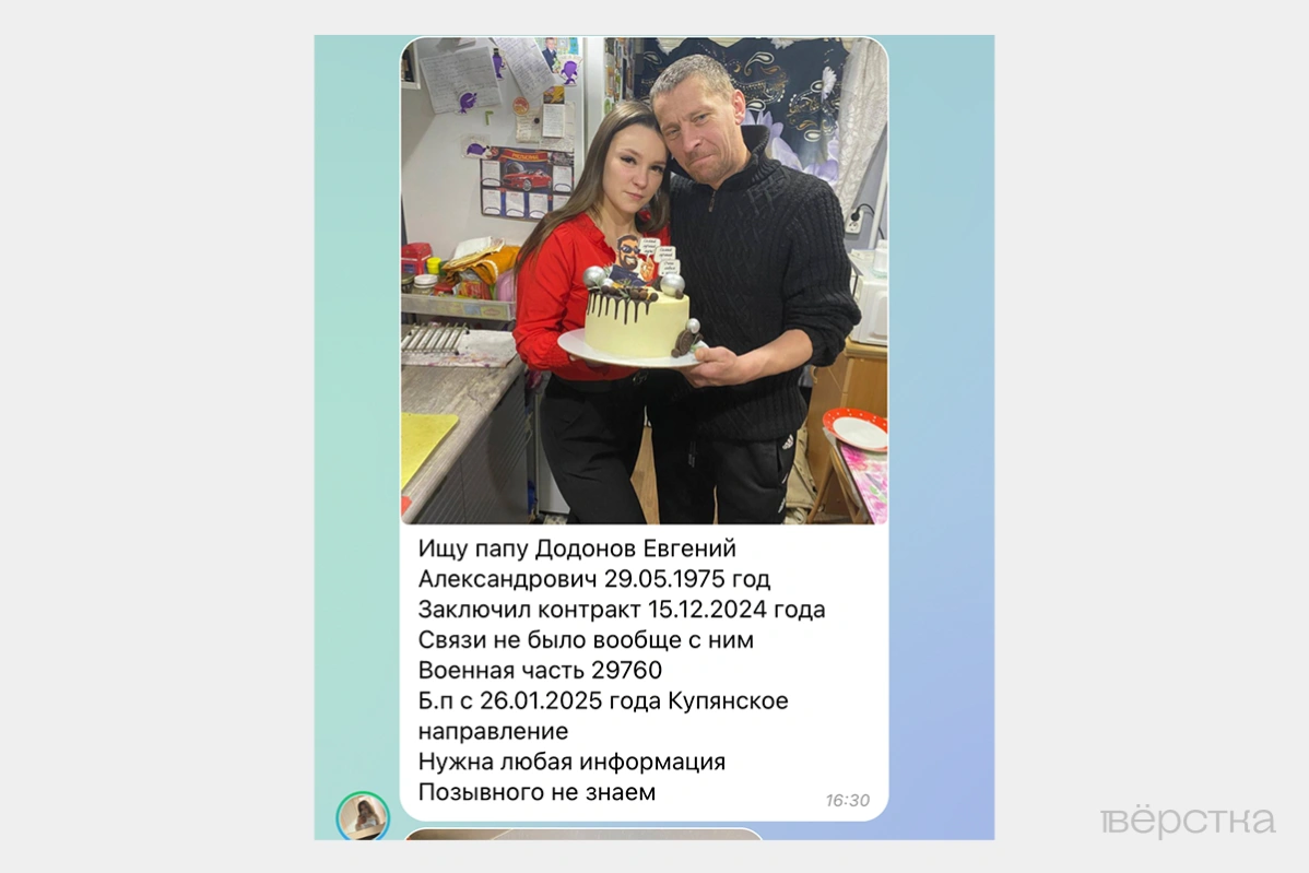 Отец Розановой — Евгений Додонов — числится как пропаший без вести, об этом ей сказали по телефону военной части. «Бабушка себя очень плохо чувствует. Не спит ночами, не ест вообще ничего», — рассказывает Розанова о состоянии семьи после пропажи отца и дяди.
