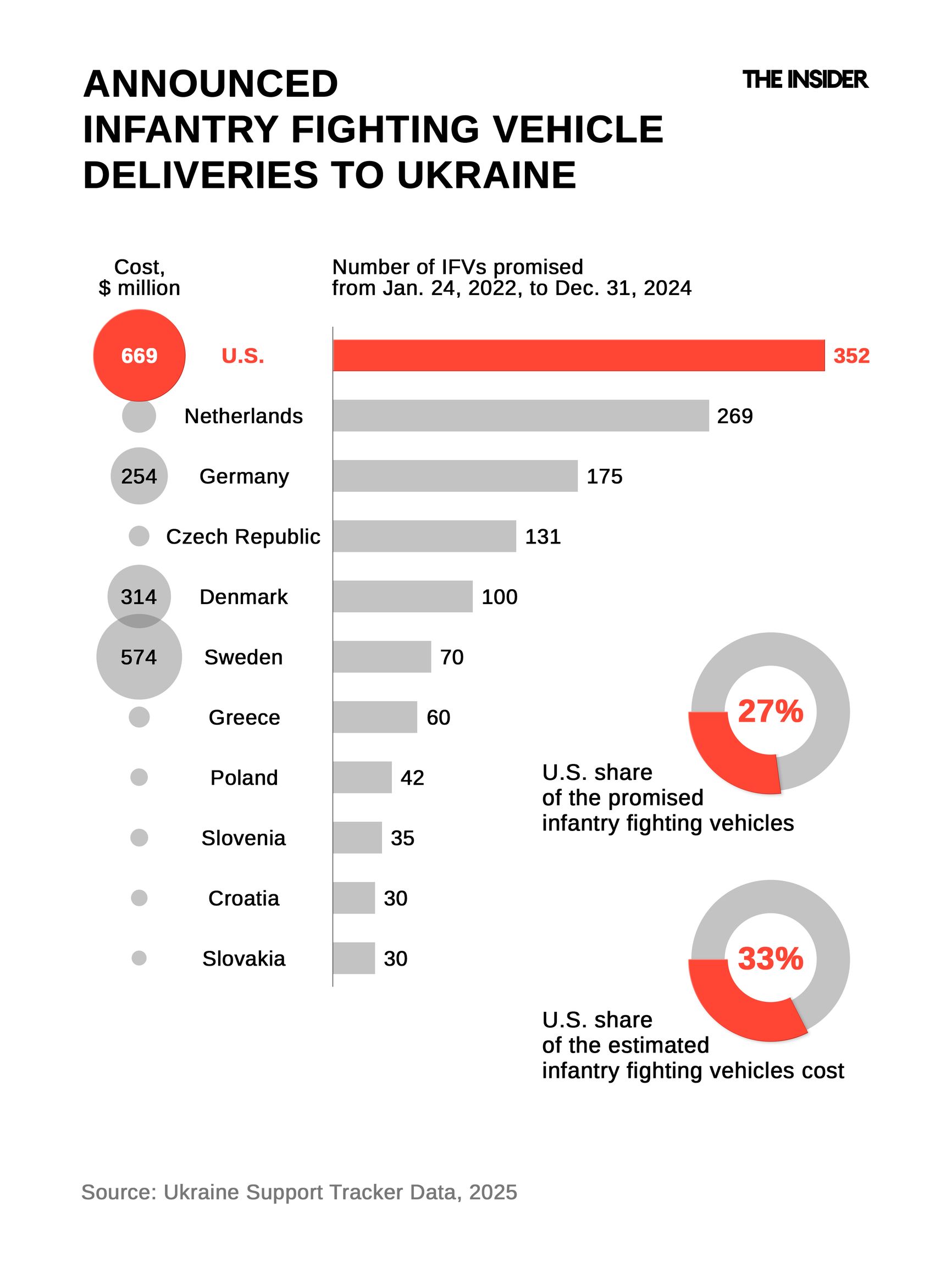 In the infantry fighting vehicle (IFV) category, the U.S. has provided 352 out of 1,294 total IFVs, worth $669 million out of $2.1 billion. These are mostly M2A2 ODS Bradley vehicles, which have proven highly effective in combat. While the U.S. leads in quantity and total cost, two-thirds of all IFVs supplied to Ukraine come from other allies.