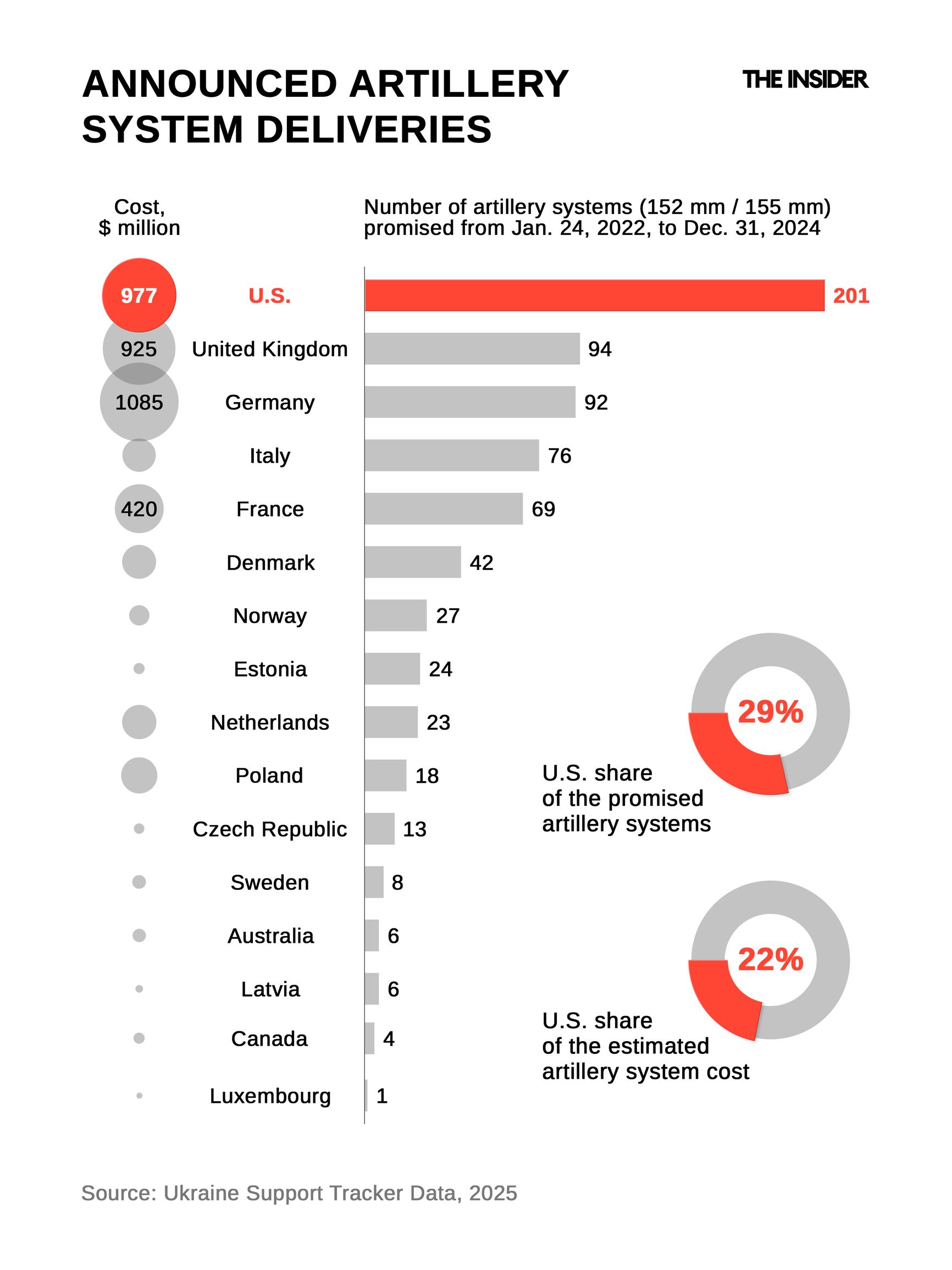 As for artillery systems of the 152mm and 155mm calibers, the U.S. leads in number (201 out of 704) but ranks second in financial value after Germany ($977 million out of $4.5 billion). However, 142 of the U.S.-supplied howitzers are M777 towed artillery, rather than the more highly sought-after self-propelled artillery systems on wheels or tracks. The Ukrainian defense publication Militarnyi argues that towed artillery has key advantages such as easier concealment, easier placement in dug-out fortified positions, and reduced vulnerability in case of ammunition detonation, as munitions are stored separately from the gun itself. Meanwhile, upcoming deliveries of Swedish Archer self-propelled artillery (18 units) and Danish and French Caesar howitzers (60 units) will further reduce the relative U.S. contribution in this category.