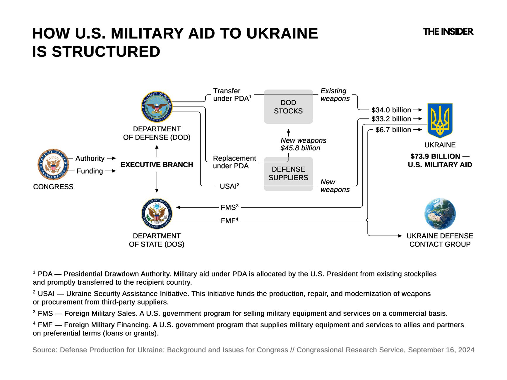 U.S. security assistance to Ukraine follows a three-pronged system in which Congress allocates funds to the executive branch, and the President, Pentagon, and State Department distribute them via three primary mechanisms: the Presidential Drawdown Authority (PDA), the Ukraine Security Assistance Initiative (USAI), and Foreign Military Financing (FMF).