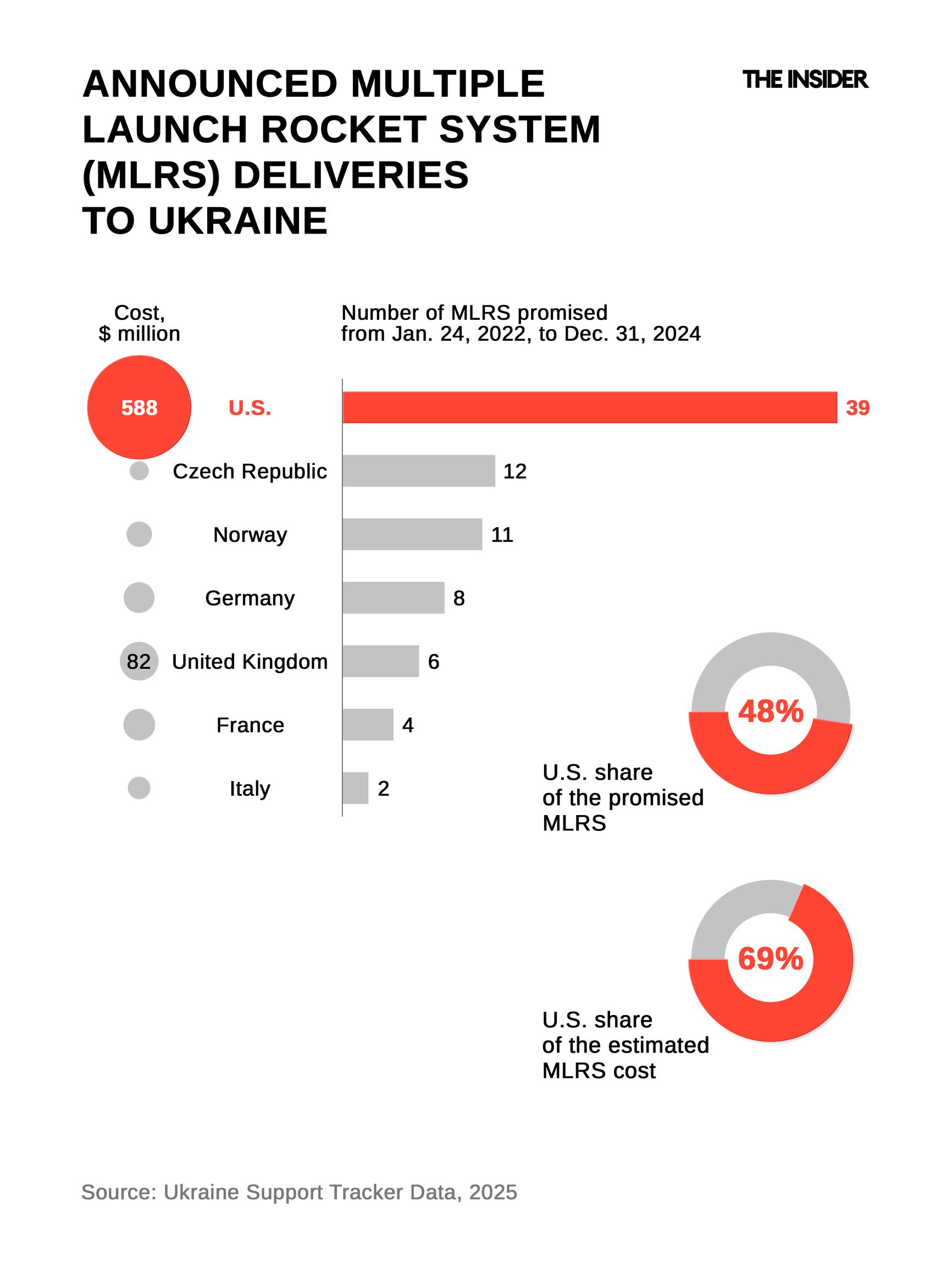 Still, there are areas where U.S. assistance is crucial. American HIMARS make up nearly half (39 out of 82) of the multiple-launch rocket system (MLRS) units sent to Ukraine and account for nearly 70% of the total value ($588 million out of $857 million). For a long time, HIMARS were the only means available to Ukraine for long-range precision strikes against Russian forces — even if the U.S. banned their use on internationally recognized Russian territory. Ukraine remains entirely dependent on U.S. for ATACMS missiles and for ammunition supplies for HIMARS, some of which have already run out. For now, future deliveries appear limited to pre-contracted volumes within USAI.