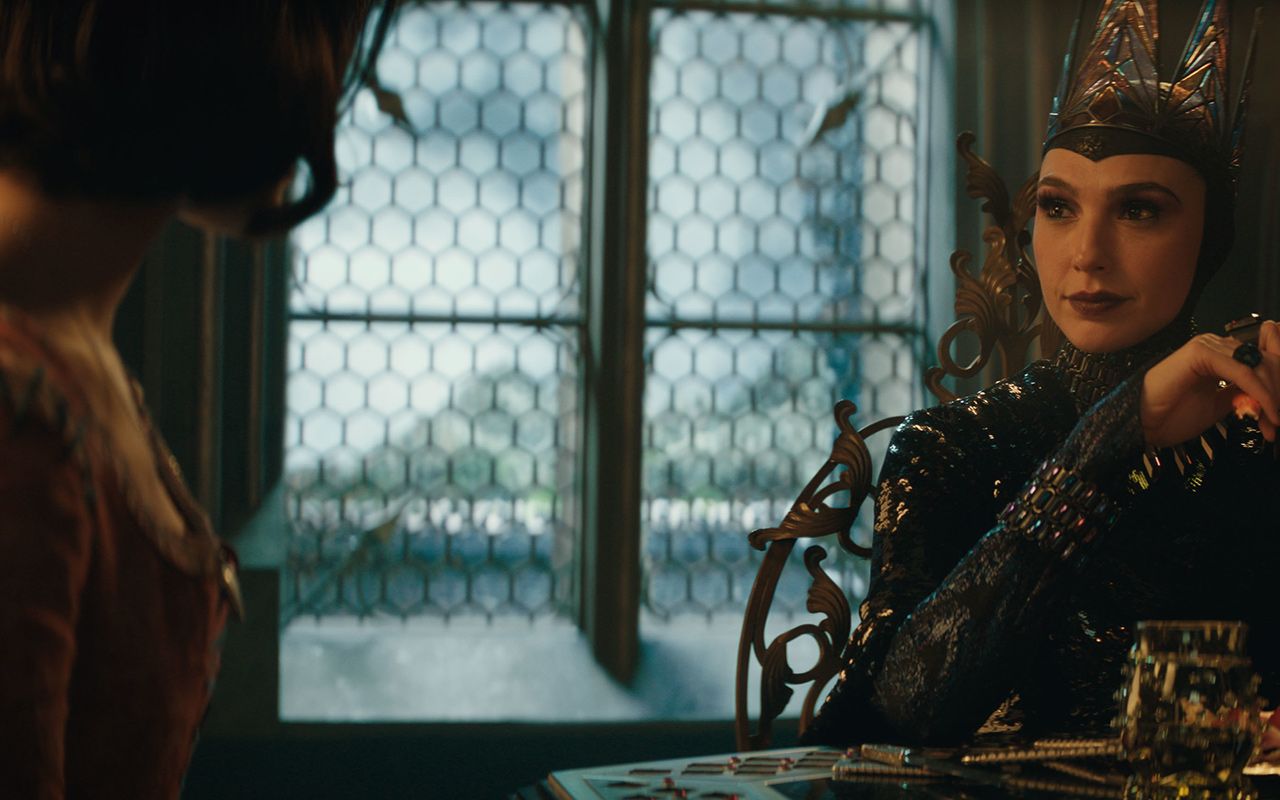 Во-вторых, сочетание смешного и жуткого: до сих пор пугающие малышей сцены бегства Белоснежки в лес, преображения королевы в колдунью и собственно отравления заколдованным яблоком. Здесь они поставлены со старательностью школьного спектакля, но не работают вовсе — прежде всего потому, что Галь Гадот даже в самом зловещем гриме обладает аурой положительного персонажа. Авторы будто чувствуют это, издеваясь над горе-антагонисткой: собственные стражники ее не слушаются, сбежать из ее тюрьмы — плевое дело, хоровое пение безоружной толпы обращает ее в бегство. Персонаж еще и попросту плохо придуман — инфантильная зацикленность на собственной внешности никак не сочетается с доморощенным маккиавелизмом, властолюбием и жадностью.