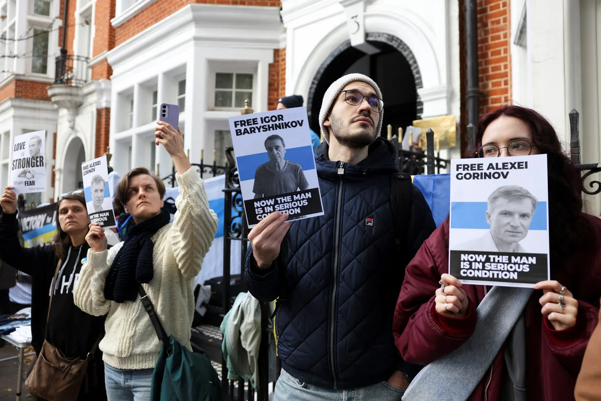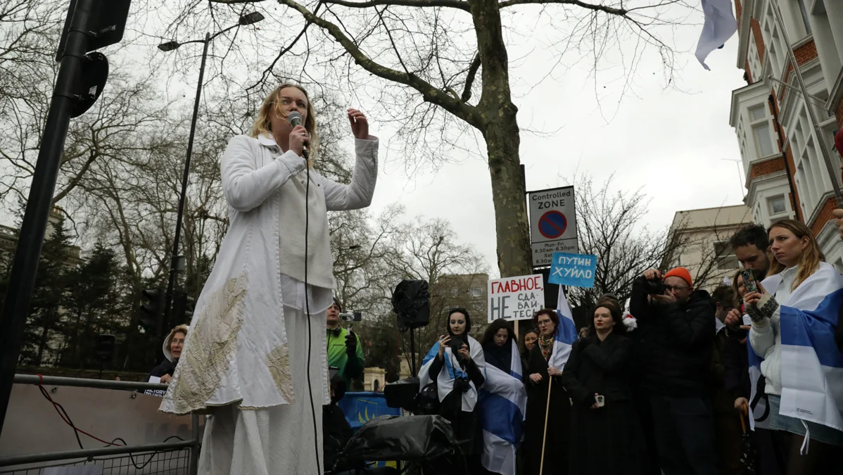 Ксения Максимова на акции у посольства России в Лондоне, 25 февраля 2024 года. Фото: Hannah Ellison / Reuters / Scanpix / LETA