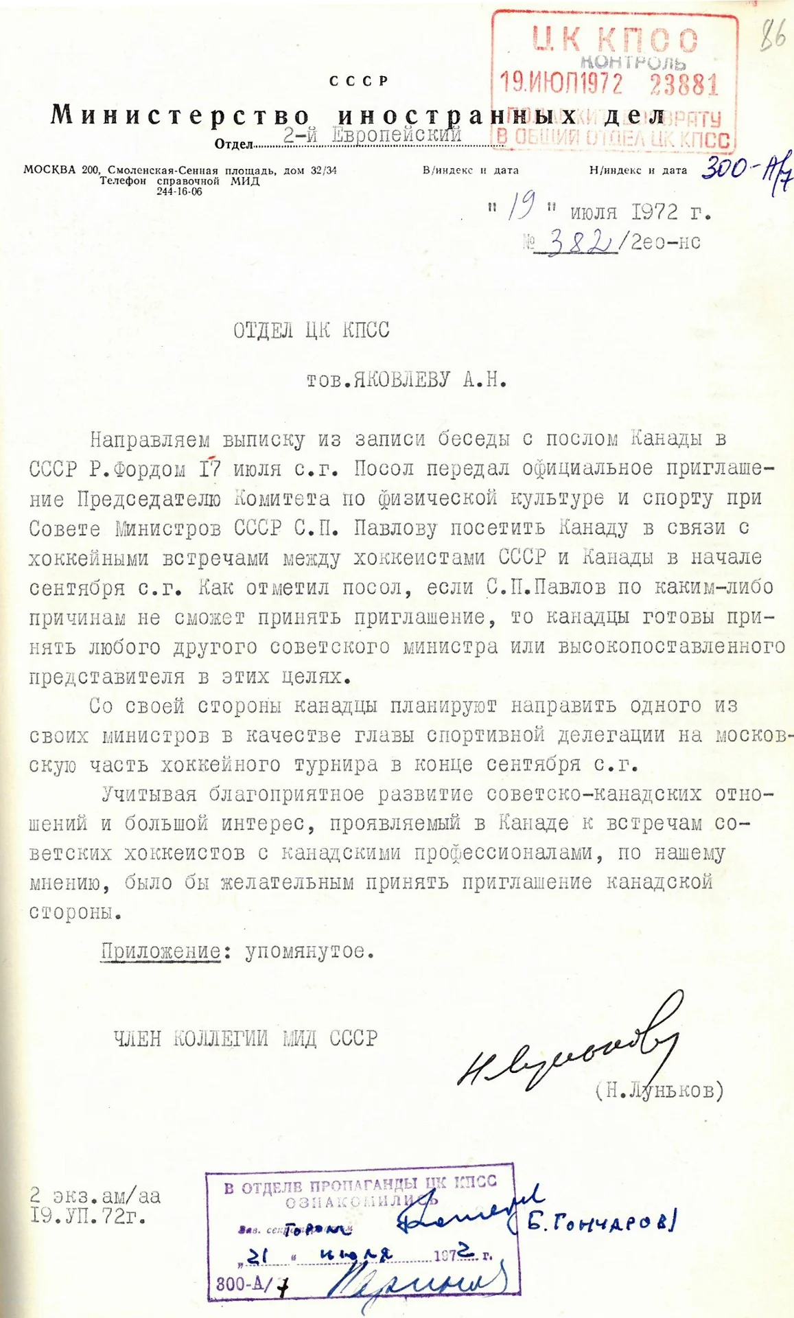 Советская бюрократическая машина реагировала на разные предложения канадской стороны — лето выдалось во всех смыслах горячим. Активно действовал посол Канады в СССР Роберт Форд, личность по-своему легендарная. Поэт, переводчик и дипломат, он проработал на своем посту в Москве 16 лет — с 1964 по 1980 год. 19 июля 1972-го Форд встретился с членом коллегии МИД, заведующим Вторым европейским отделом министерства Николаем Луньковым, личностью в своем профессиональном цеху тоже легендарной. Во всяком случае, ему через год предстоял отъезд в Лондон в качестве посла СССР в Великобритании, а затем он десять лет отработает на посольской должности в Италии. Интересна личная история Николая Митрофановича и тем, что он прожил 102 года…