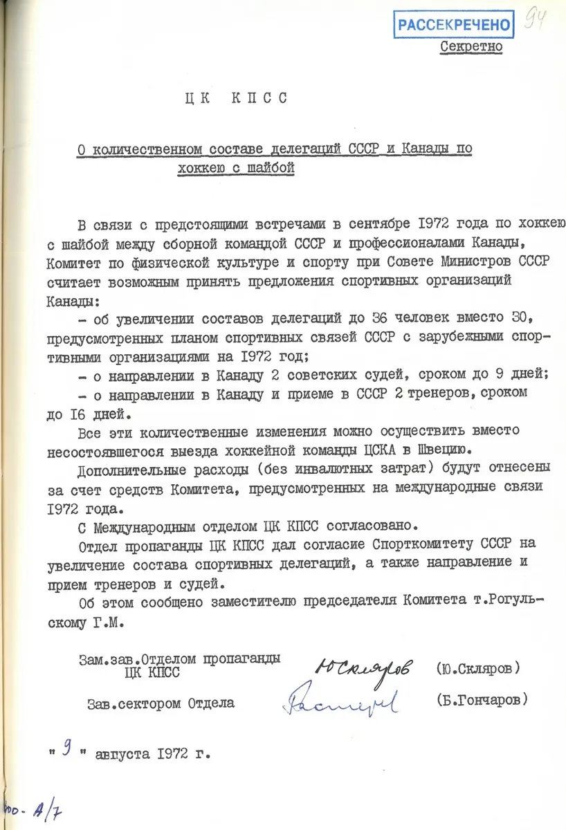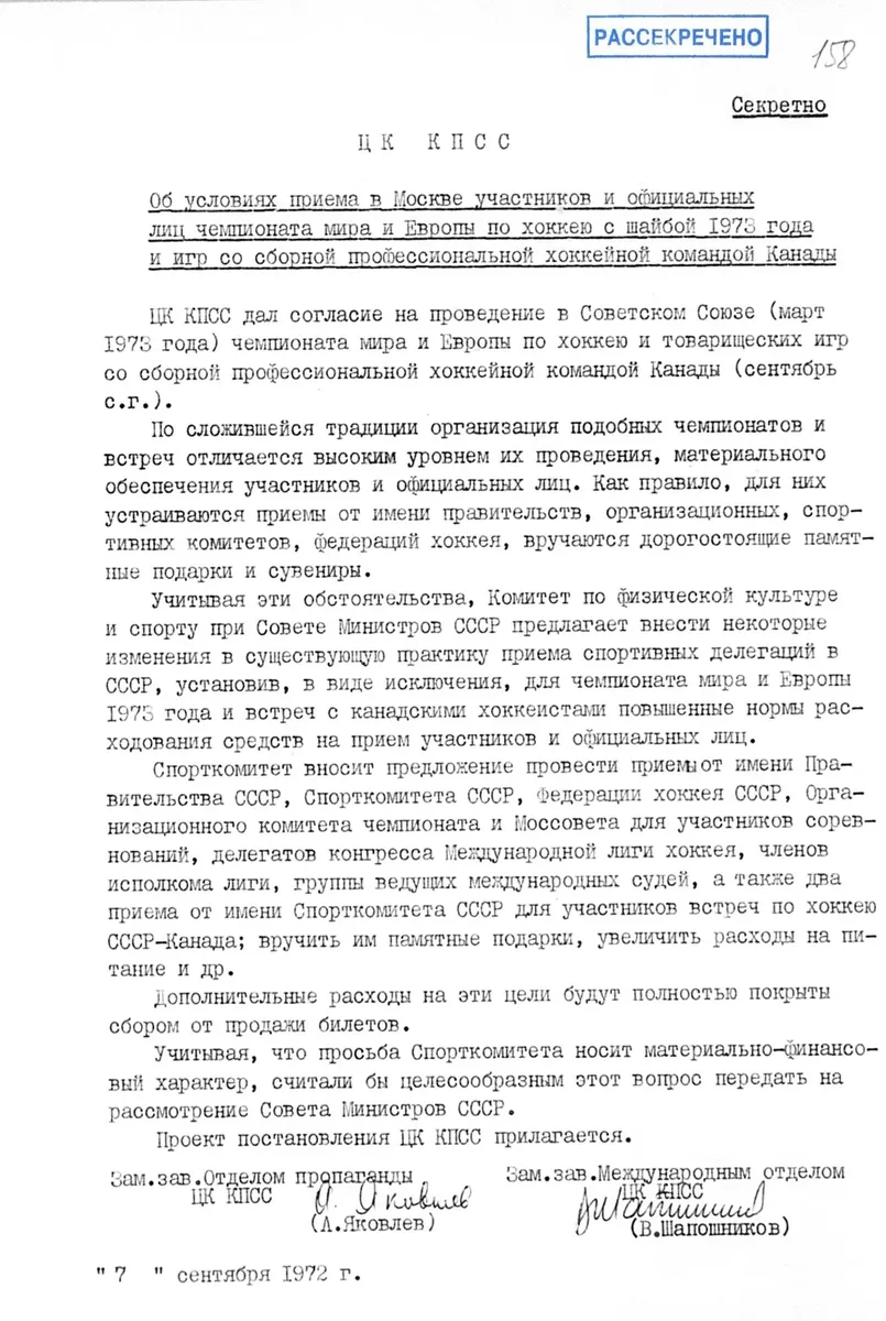 7 сентября, когда уже канадская часть Суперсерии близится к концу, ЦК в лице двух замзавов — отдела пропаганды (Александр Яковлев) и международного отдела (Виталий Шапошников; Черняев, судя по его дневникам, в это время был в командировке в Италии) одобряют предложение Спорткомитета и сообщают о необходимости перенаправить его в Совмин Союза, поскольку речь идет об увеличении финансирования.