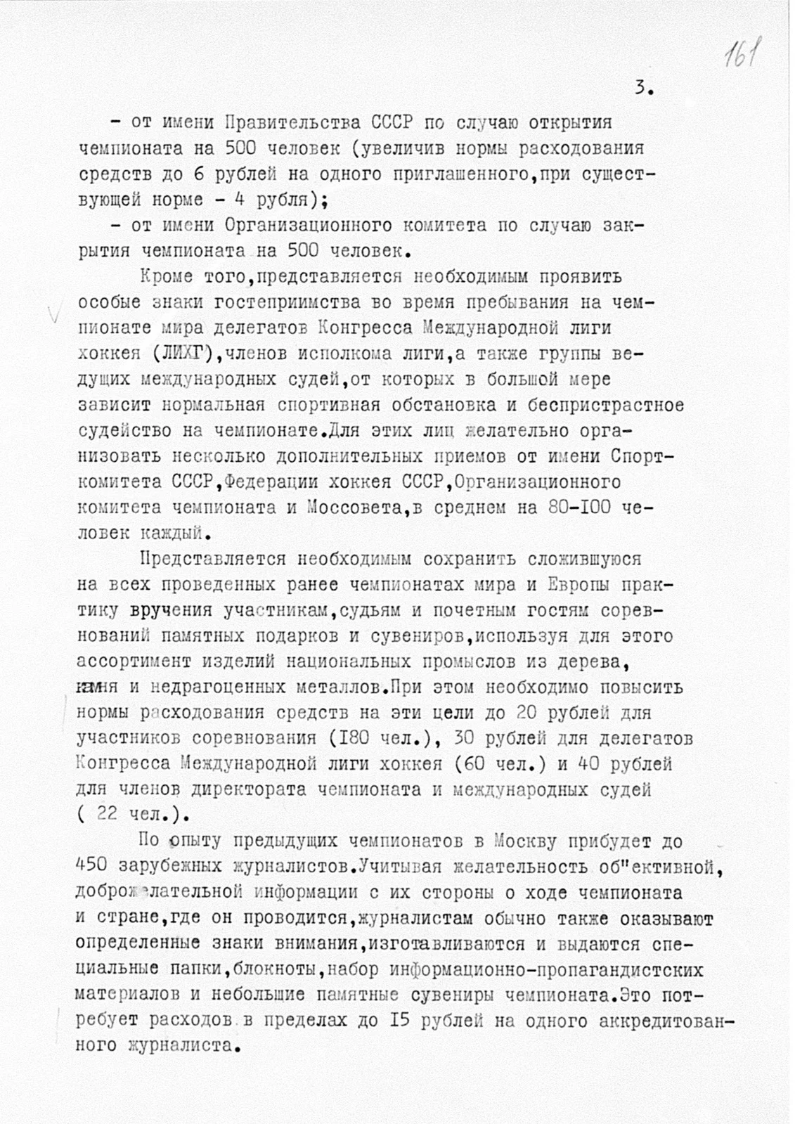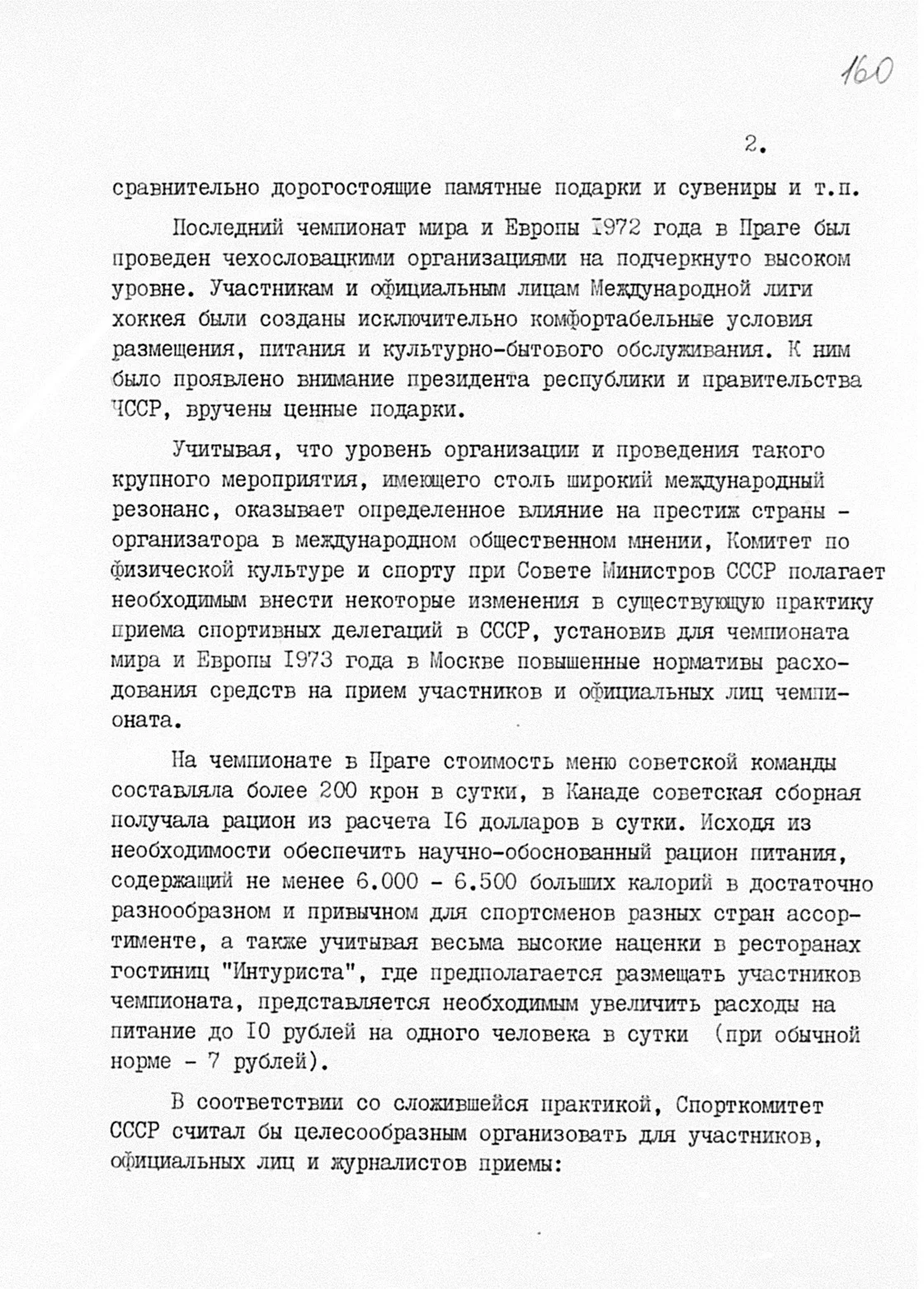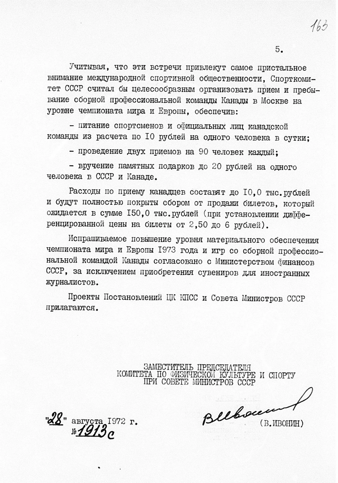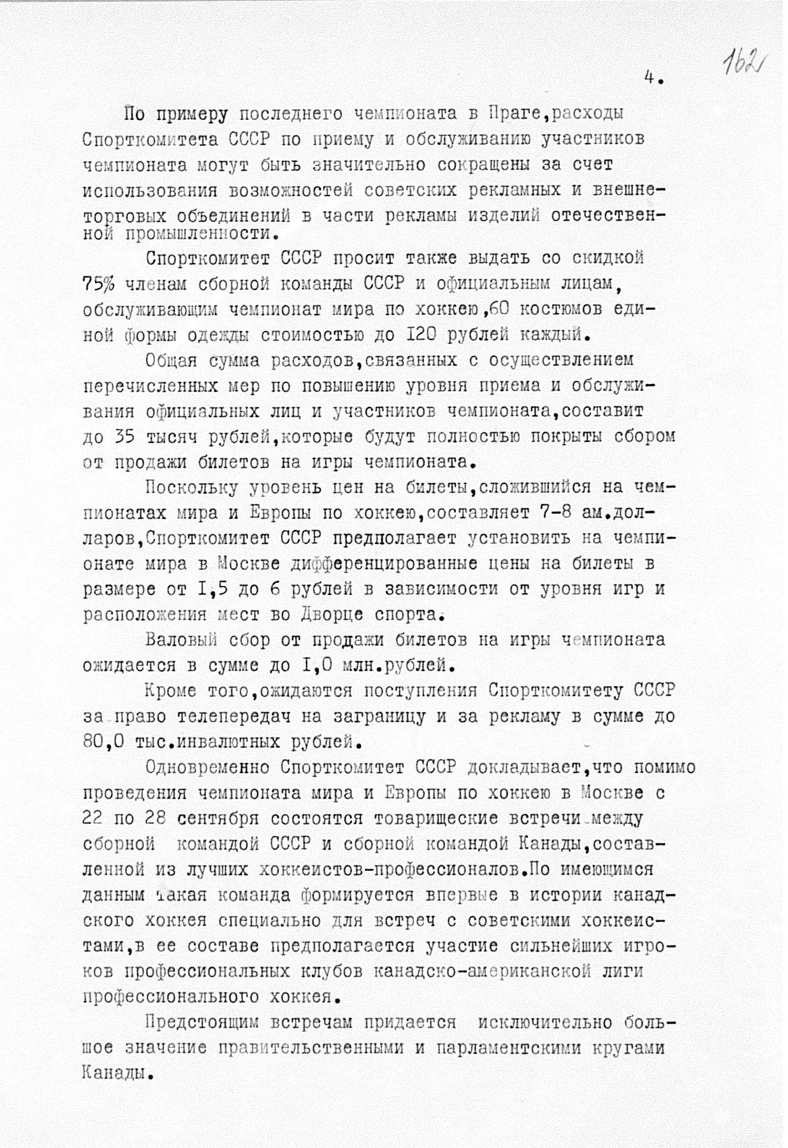 А значит, прибывающих на чемпионат мира — 1973 надо удивить размахом гостеприимства — в частности, увеличить расходы на питание гостей, сувениры и памятные подарки. Но удивлять надо начинать уже сейчас, в ситуации, когда Суперсерии придается особое «значение правящими кругами Канады». И тогда вместо 7 рублей в сутки расходы на питание прибывающей делегации нужно увеличить до 10 рублей в сутки на человека, выделить деньги на два приема по 90 человек каждый и на сувениры подороже. Все это будет с лихвой покрыто доходами от продажи билетов, стоимость которых в ходе сентябрьских игр составит от 2,5 до 6 рублей.