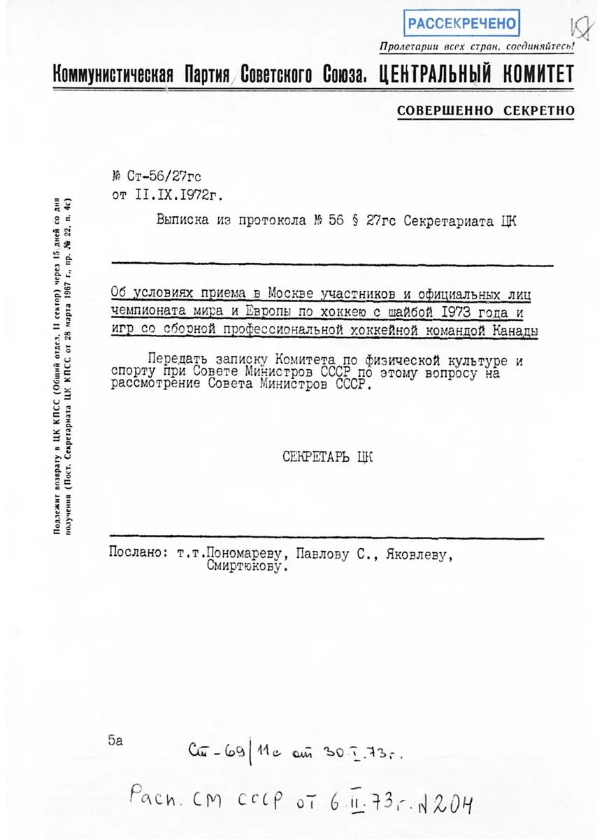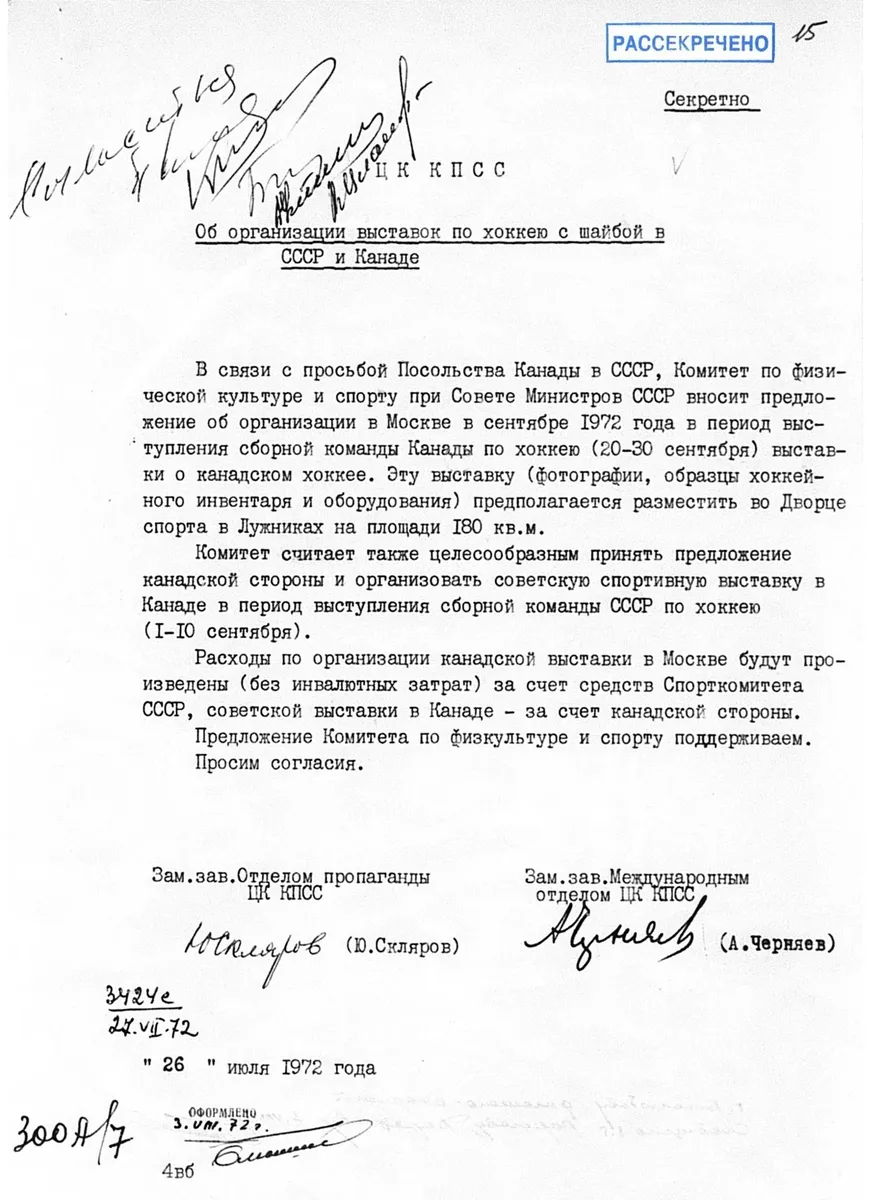 В июле канадцы предложили советской стороне проведение выставок о хоккее на взаимной основе. Против чего советская бюрократия возражать не стала и одобрила идею на уровне ЦК, причем под документом стоит подпись уже не только знакомого нам Склярова, но и заместителя заведующего международным отделом ЦК Анатолия Черняева. Это абсолютно выдающаяся личность, один из главных партийных интеллектуалов и либералов, будущий советник Михаила Горбачева по международным делам, человек, оставивший потомкам гигантский свод личных дневников, раскрывающих механизм работы советской власти.