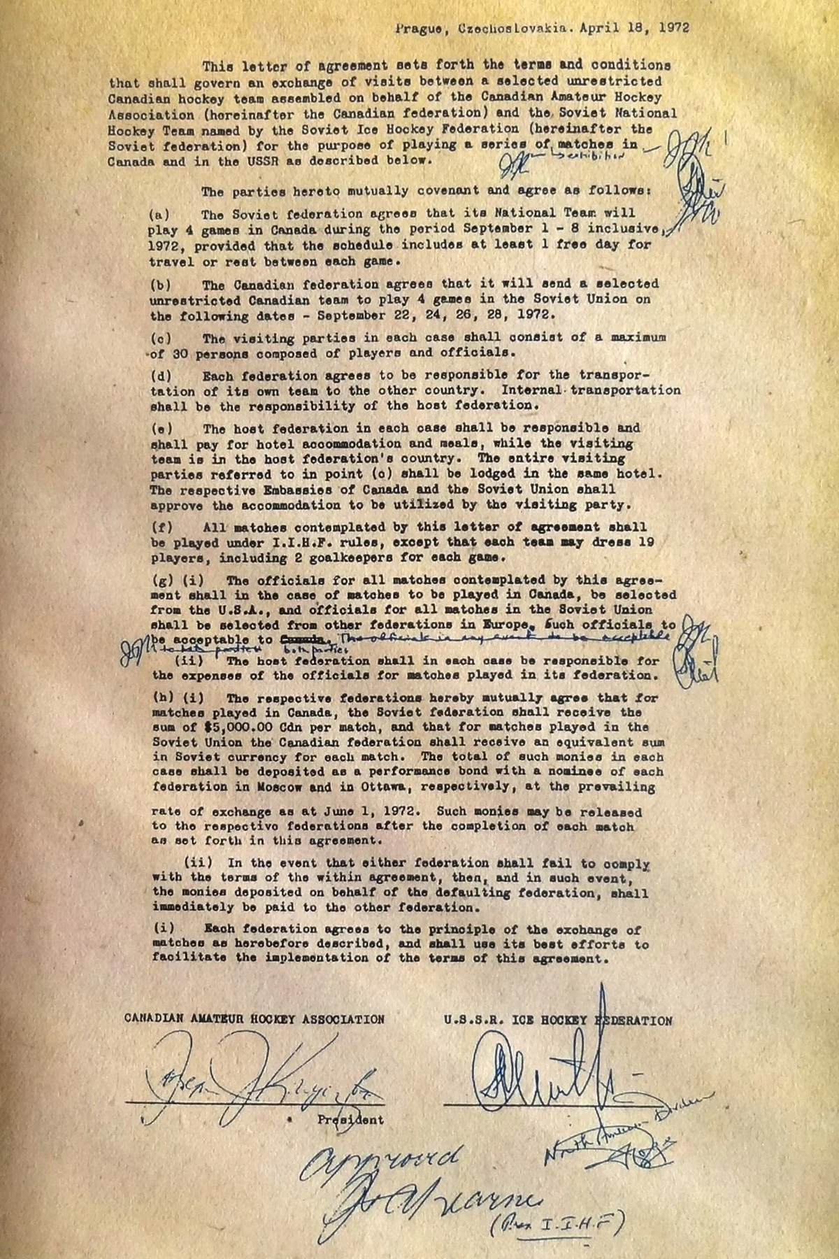 18 апреля 1972-го, во время чемпионата мира в Праге, официальные лица с обеих сторон договорились о том, что Серия будет проведена. Одним из моторов переговоров с канадской стороны был юрист и хоккейный функционер Джо Кричка по прозвищу «Судья Джо», возглавлявший канадскую любительскую ассоциацию (CAHA) и впоследствии заслуженно введенный в канадский Зал хоккейной славы. С советской стороны соглашение подписал Андрей Старовойтов. Документ завизировали и руководители Международной федерации хоккея Джон «Банни» Ахерн и Фред Пейдж, который, прежде чем стать замом Ахерна, возглавлял CAHA. Ахерн, к слову, с перерывами управлял федерацией в течение 12 лет, а руководителем Британской ассоциации хоккея оставался несколько десятилетий, впервые вступив в эту должность в 1933 году. Одобрение Ахерном Суперсерии было особенно важно, учитывая, что он всегда был против участия канадских профессионалов в каких-либо «любительских» соревнованиях.