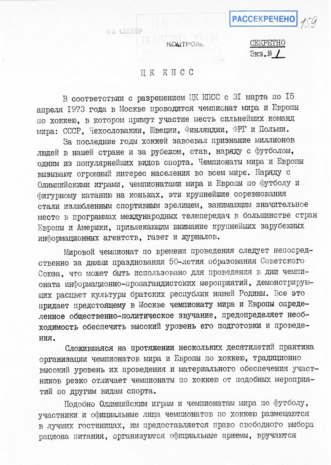 В августе возникает новая тема — и как раз с учетом перспективы московского чемпионата мира 1973 года. 28 августа спортивный чиновник Виктор Ивонин, зампред Спорткомитета (на этой позиции он проработает 15 лет), направляет бумагу в ЦК, усиливающую хоккейную экспансию СССР за счет широты гостеприимных жестов — и здесь Суперсерия идет в увязке с чемпионатом мира — 1973.