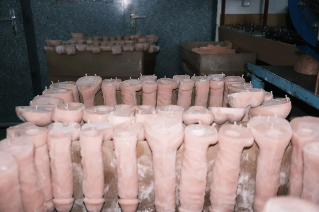 Большинство коробок в этот день заполнены фаллоимитаторами. Несколько «Гигантов», подвешенных за яички по периметру коробки, сохнут — их, как и прочие изделия, предварительно припудрили, чтобы они не слиплись. Рядом лежат двойные фаллоимитаторы — на сайте они обозначены как игрушки для пар, между собой сотрудники называют их «лесбиянками».