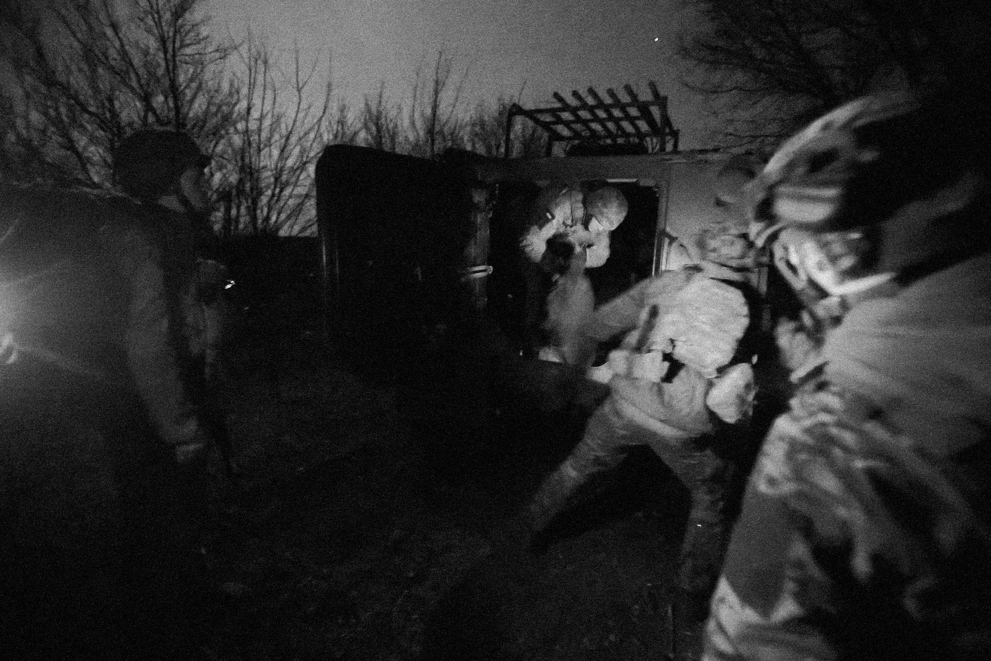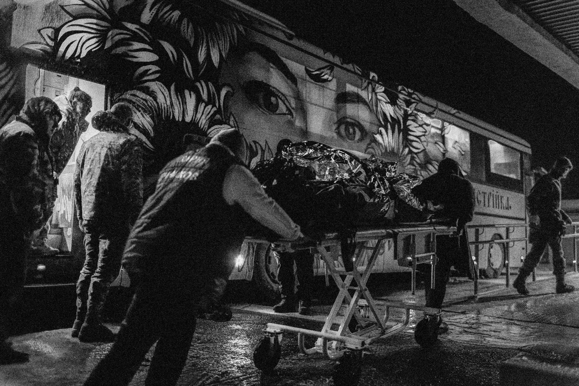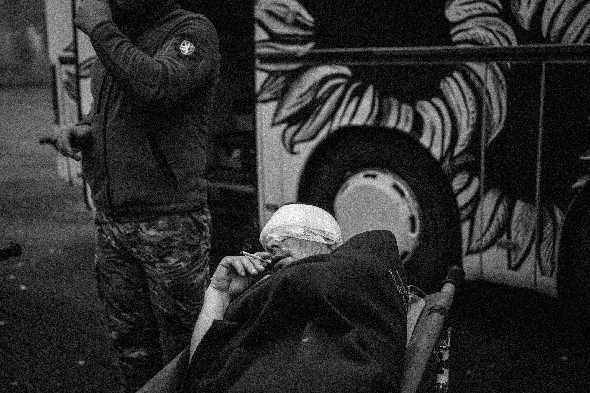Ходячие раненые зябко ковыляют от дверей больнички и набиваются в автобус. У каждого в руках — «форма 100», подслеповатый листочек бумаги с информацией о ранении. Они выглядят потерянно, как жертвы кораблекрушения. Командир экипажа уверенным голосом помогает им сориентироваться: «Так, друзья, буду называть фамилии, если ошибусь в ударении, извините. Поднимайтесь на борт, садитесь, куда удобно. Девчата, там сзади есть места?.. Буряк?» — «Я…» — «Лисовский?» — «Я…» — «Гончарук?» — «Я…» — «Данилов?» — «Я…» — «„Сотки“ у всех на руках? Хлопцы, трамбуемся!» В заднюю дверь подъемником загружают лежачих, в основном с оторванными ногами.