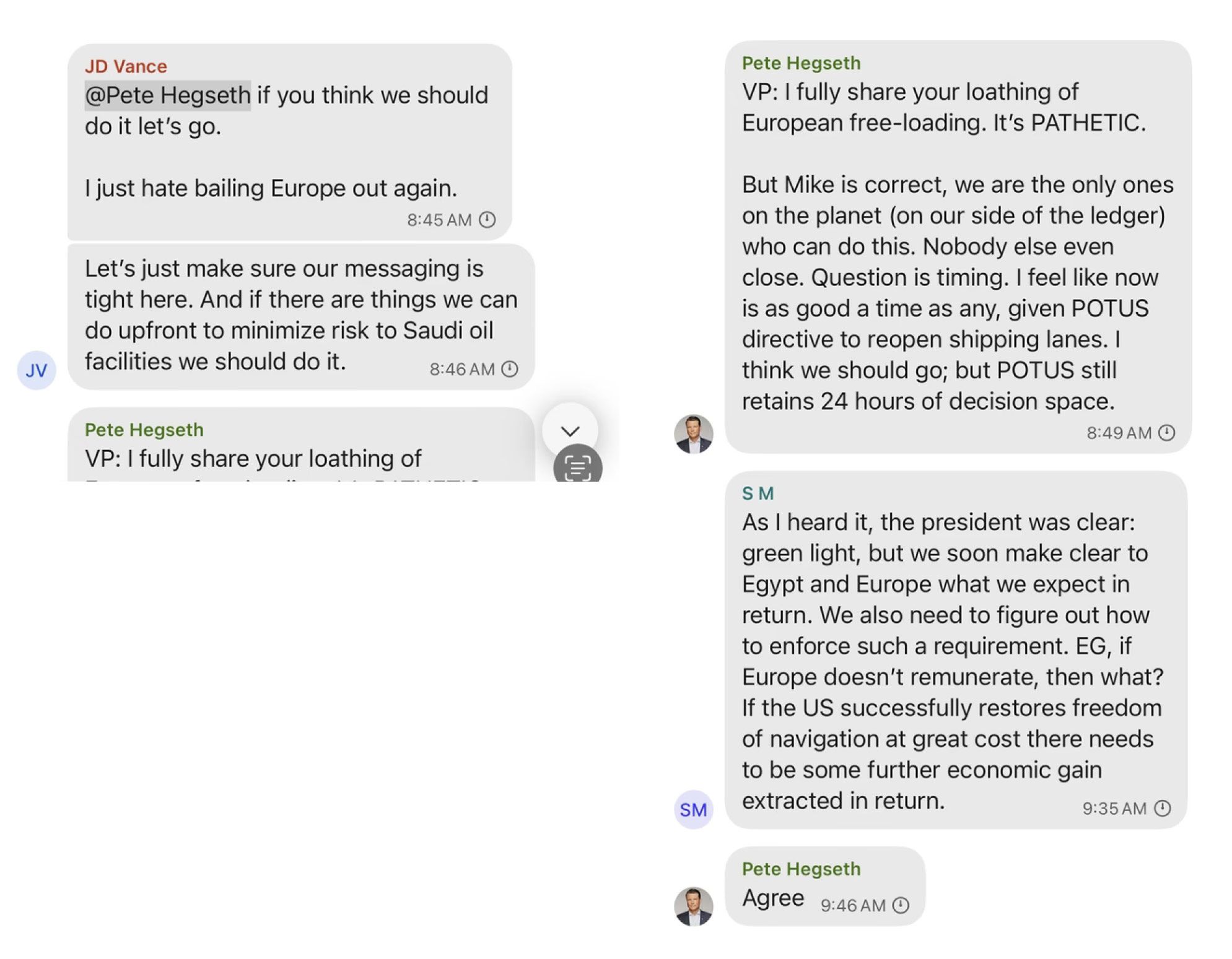 В этот день Джей Ди Вэнс поделился сомнениями в целесообразности атаки на хуситов. Он подчеркнул, что через Суэцкий канал проходит 40% европейской торговли и только 3% американской. «Я не уверен, что президент осознает, насколько это [атака на хуситов] не соответствует его нынешней риторике по отношению к Европе», — написал вице-президент и предложил отложить атаку, чтобы еще раз оценить потенциальные риски и выгоды.