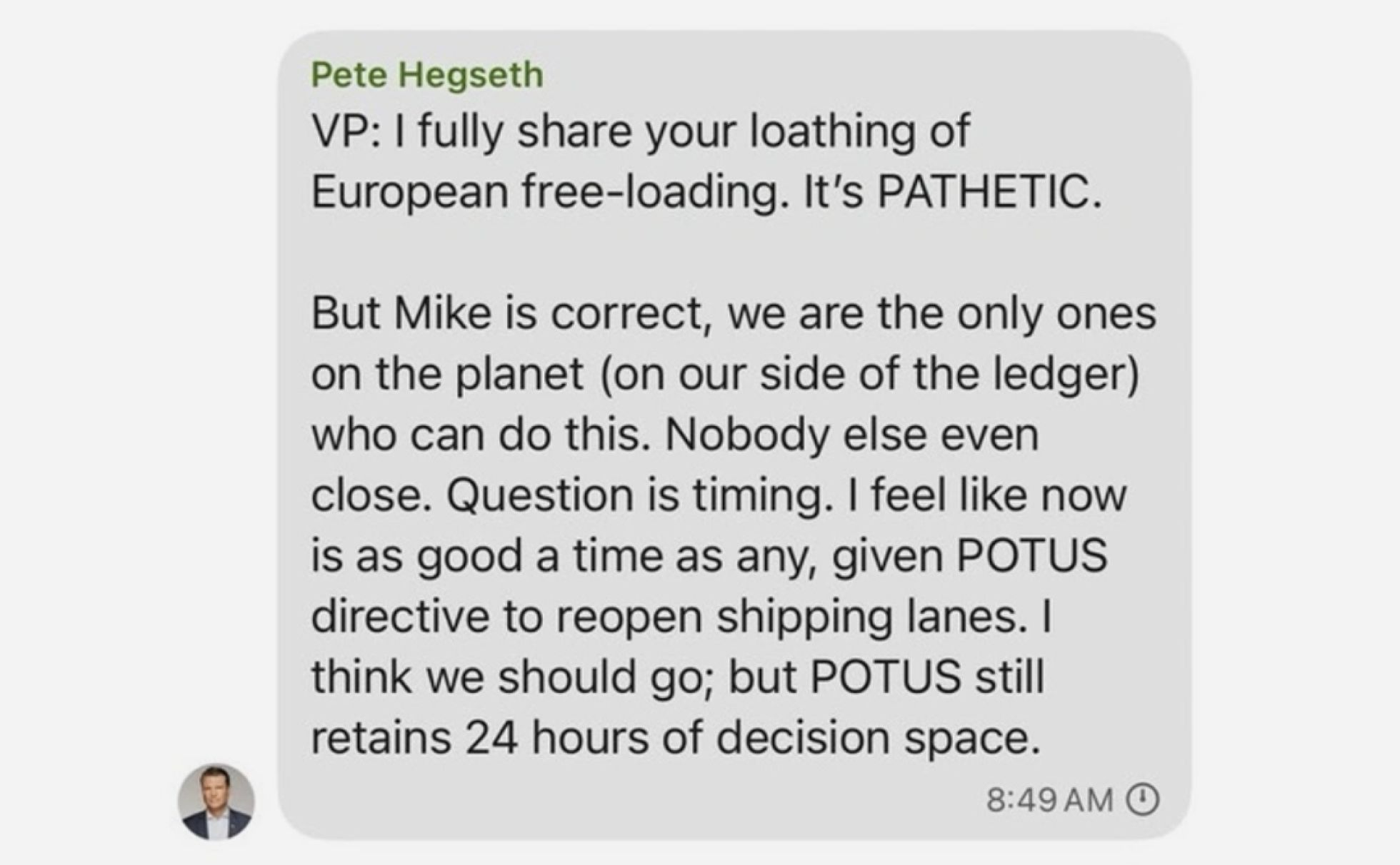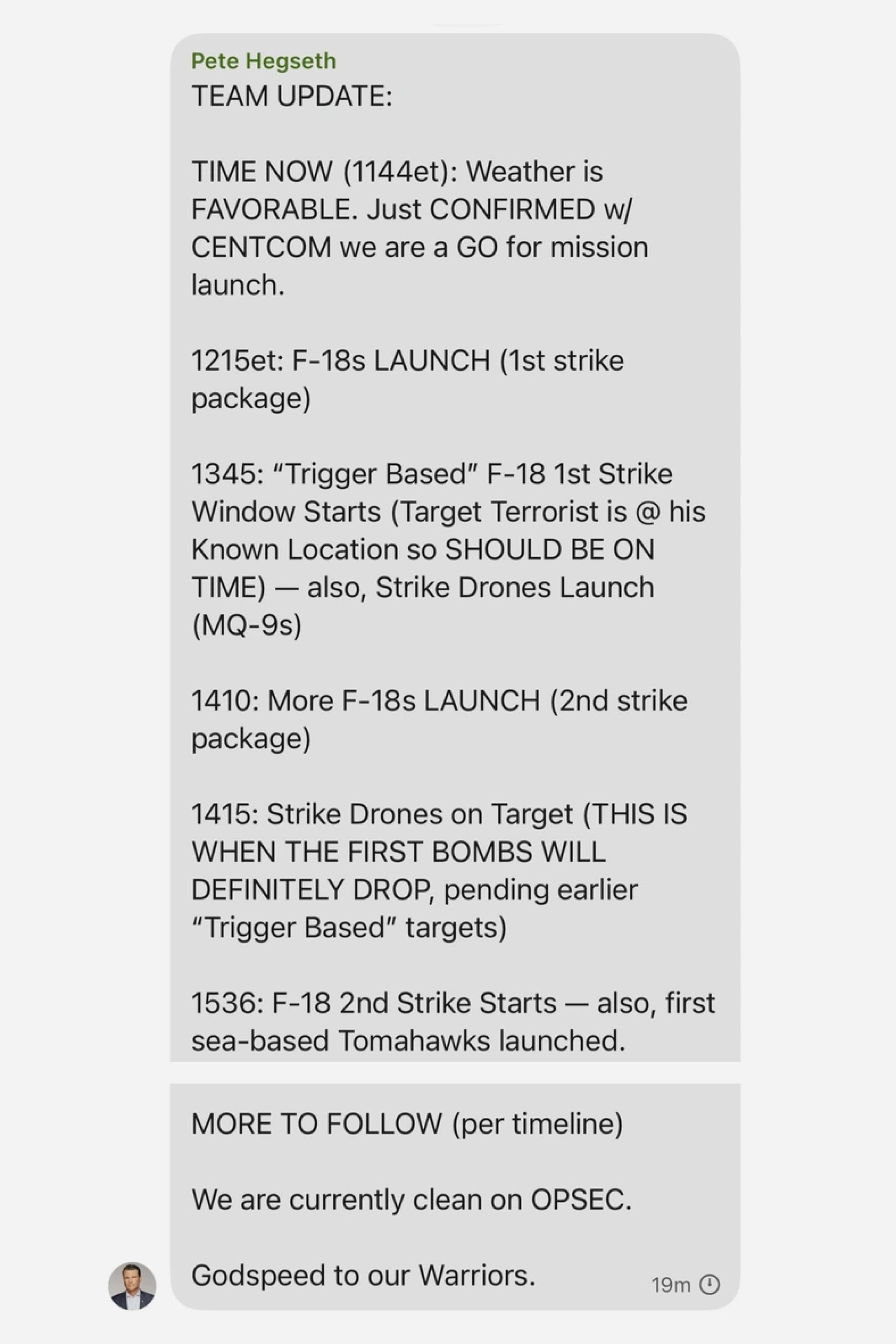 Наибольший интерес представляет сообщение министра обороны Пита Хегсета, которое The Atlantic ранее описал как план атаки на хуситов. На скриншоте видно, что Хегсет сообщил время взлета истребителей F-18, запуска дронов и ракет «Томагавк» по целям в Йемене. Позднее советник по национальной безопасности Майк Уолц отчитался, что один из лидеров хуситов был убит.