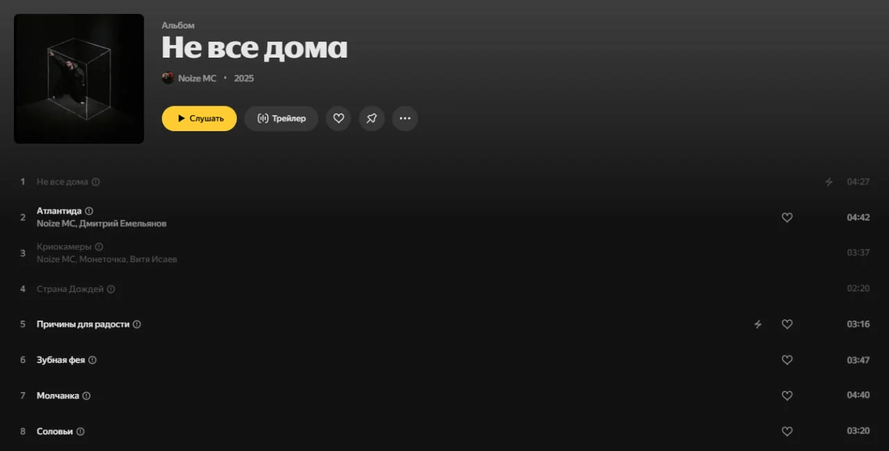 Точная причина, почему к трекам ограничили доступ, неизвестна. Сам альбом называется «Не все дома», он был выпущен 14 марта этого года. Как отмечает Forbes, эти же композиции недоступны на стримингах «Звук», «VK Музыка» и «МТС Музыка».