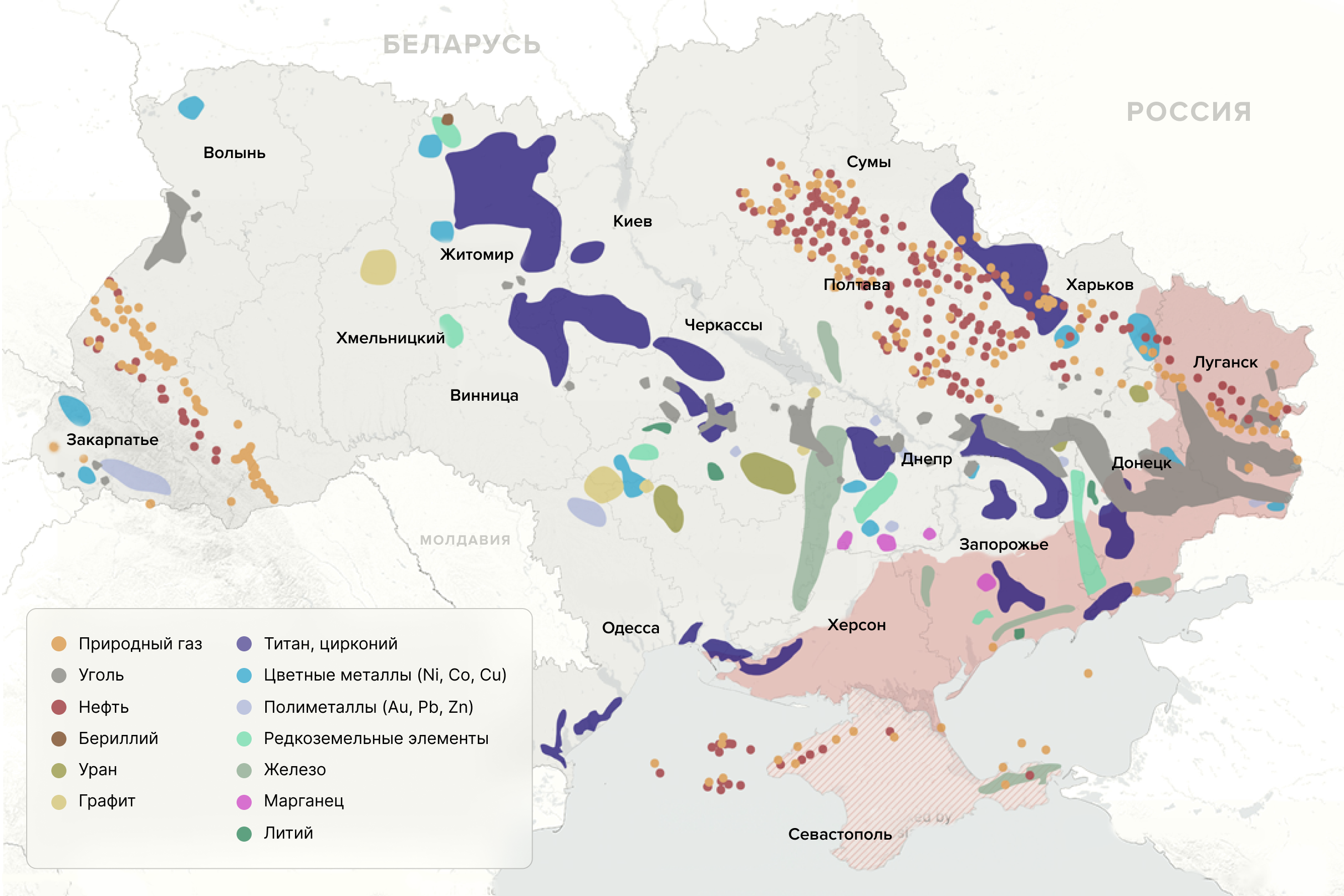 Вскоре после начала полномасштабной войны The Washighton Post писала, что Россия контролирует территории, на которых находятся 63% украинских запасов угля, 11% нефти, 20% газа, 42% металлов и 33% редкоземельных и других стратегически важных металлов.