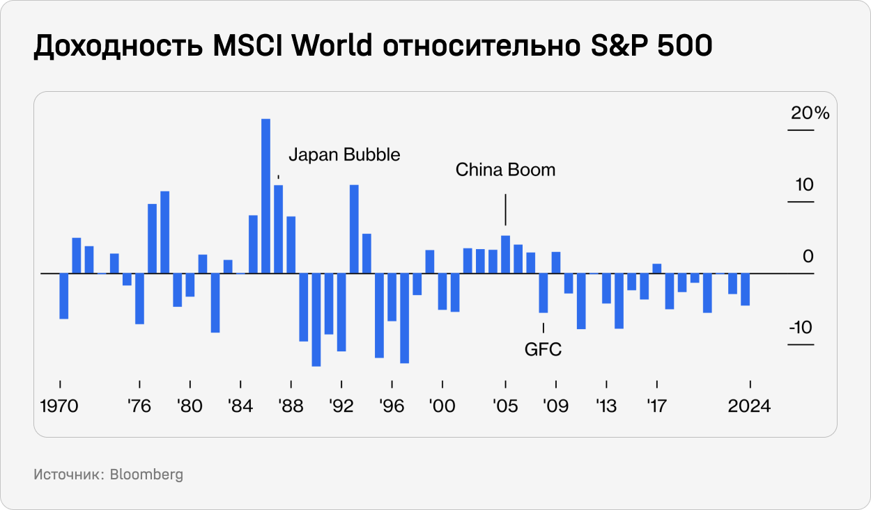 S&P 500 уверенно обходил остальной мир начиная с мирового финансового кризиса, эпицентром которого были США. Исключением стал только 2017 год, начало первого президентства Трампа. За последнее десятилетие MSCI Europe проиграл S&P 500 7,7 п. п. среднегодовой доходности, а MSCI Emerging Markets — 9,6 п. п.