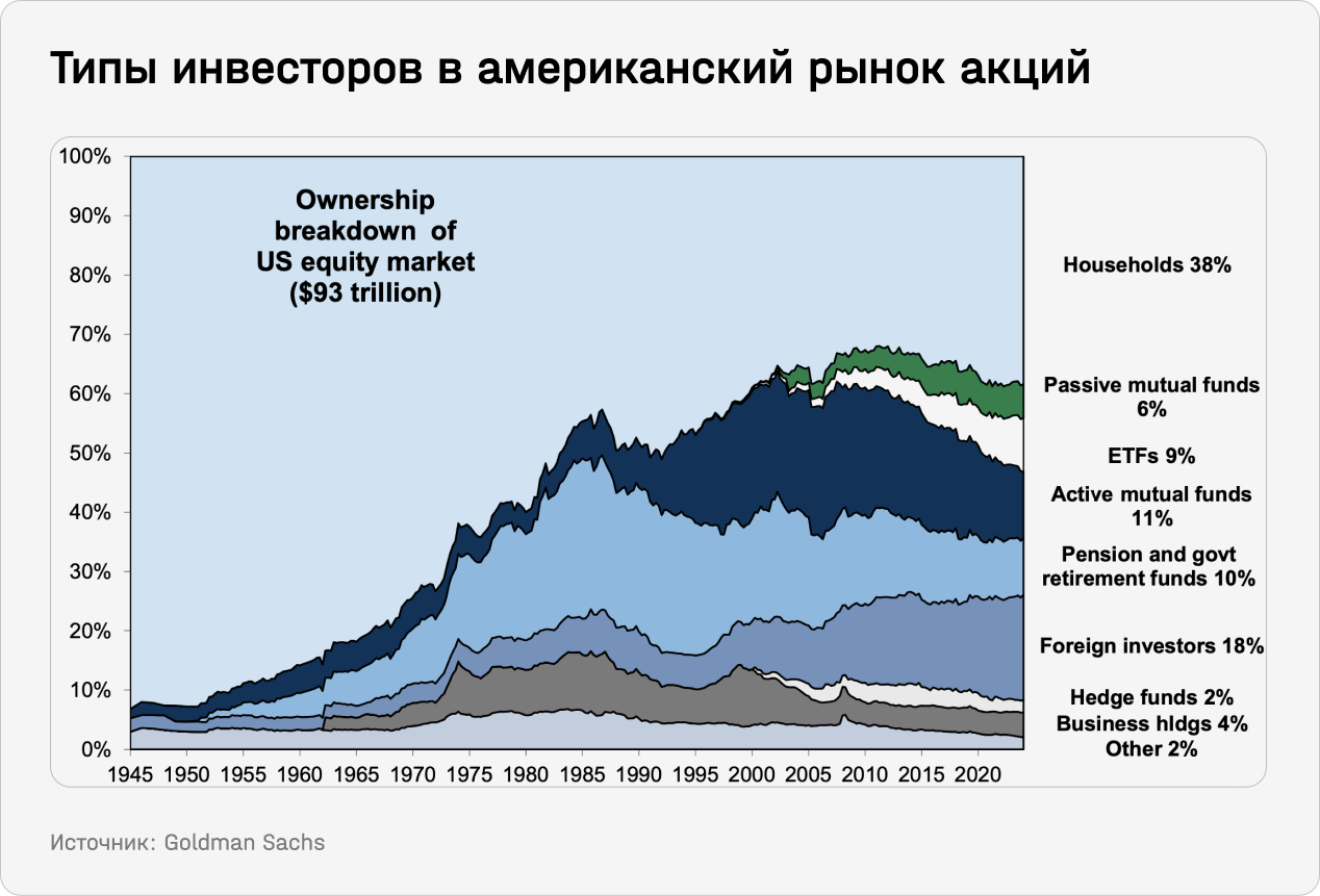 Когда-то на рынке доминировали состоятельные американские домохозяйства, но затем рынок институционализировался: доминирующие позиции заняли взаимные фонды, пенсионные, а затем и биржевые фонды. После мирового финансового кризиса влияние частных инвесторов начало возвращаться (что является одновременно симптомом и причиной растущего неравенства), а иностранное влияние становилось все более значительным. Сейчас домохозяйства — крупнейшая категория держателей акций (38%), но в нее входят и другие группы, например НКО.
