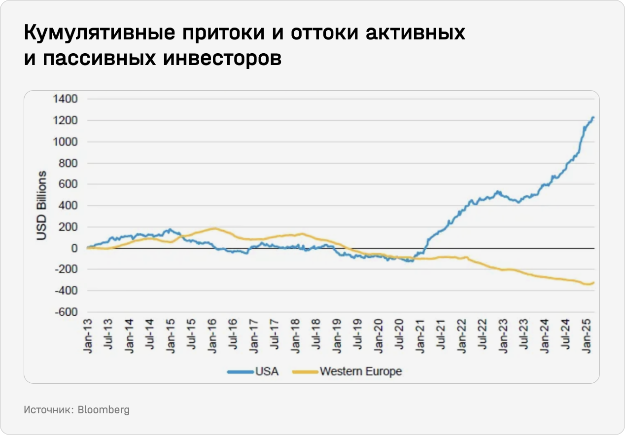 Приток денег инвесторов в американские акции стал особенно экстремальными после пандемии. Отчасти это объясняется ажиотажем вокруг «Великолепной семерки», а также отражает резкое падение доверия к Европе — стареющей, обремененной долгами и зарегулированной.