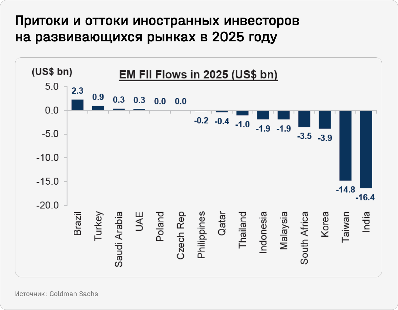 Наибольший приток средств от иностранных инвесторов с начала года пришелся на Бразилию и Турцию — благодаря как ожидаемому росту корпоративных прибылей, так и улучшению макроэкономической конъюнктуры. При этом доля иностранных инвесторов в капитализации бразильского рынка остается ниже среднего за последние 10 лет с середины 2020 года, что говорит о сохраняющейся осторожности инвесторов. Инфляционные ожидания там пока остаются высокими — на уровне 5,65% на 2025 год, следует из еженедельного опроса местного ЦБ, а пространство для снижения процентной ставки SELIC в краткосрочной перспективе — ограниченным.