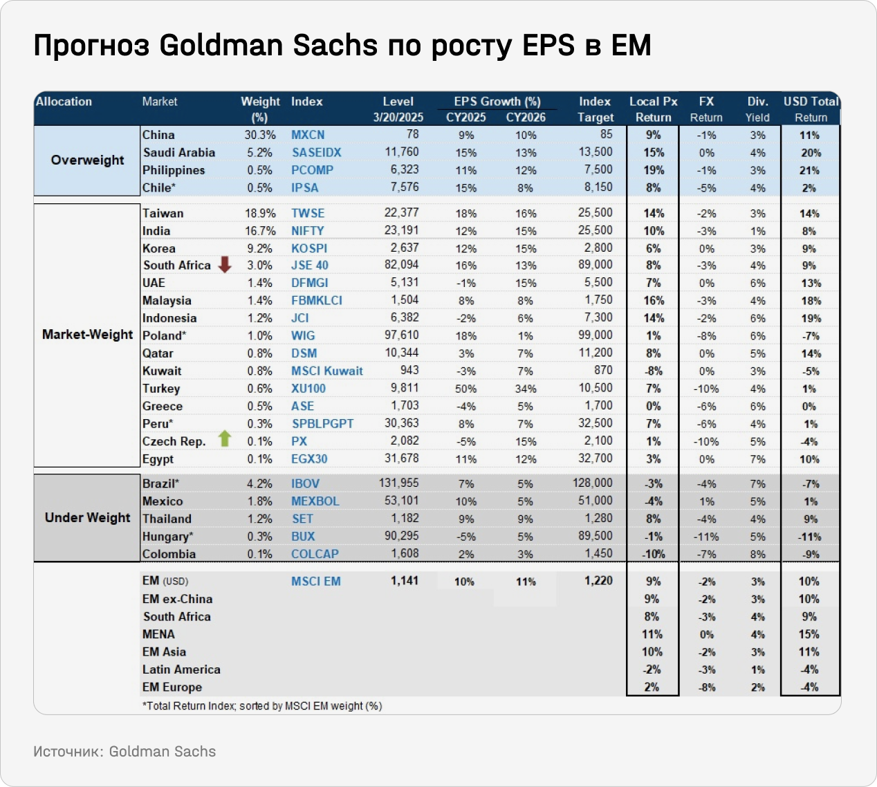 Например, Goldman Sachs прогнозирует двузначный рост прибыли на акцию (EPS) по итогам 2024 и 2025 годов для многих развивающихся рынков. Абсолютный лидер — Турция, от которой аналитики банка ждут роста прибыли на 50% в 2024 году и на 34% в 2025-м. Bloomberg пишет, что ее фондовый рынок переживает ралли из-за замедления инфляции и ожиданий дальнейшего снижения процентных ставок.