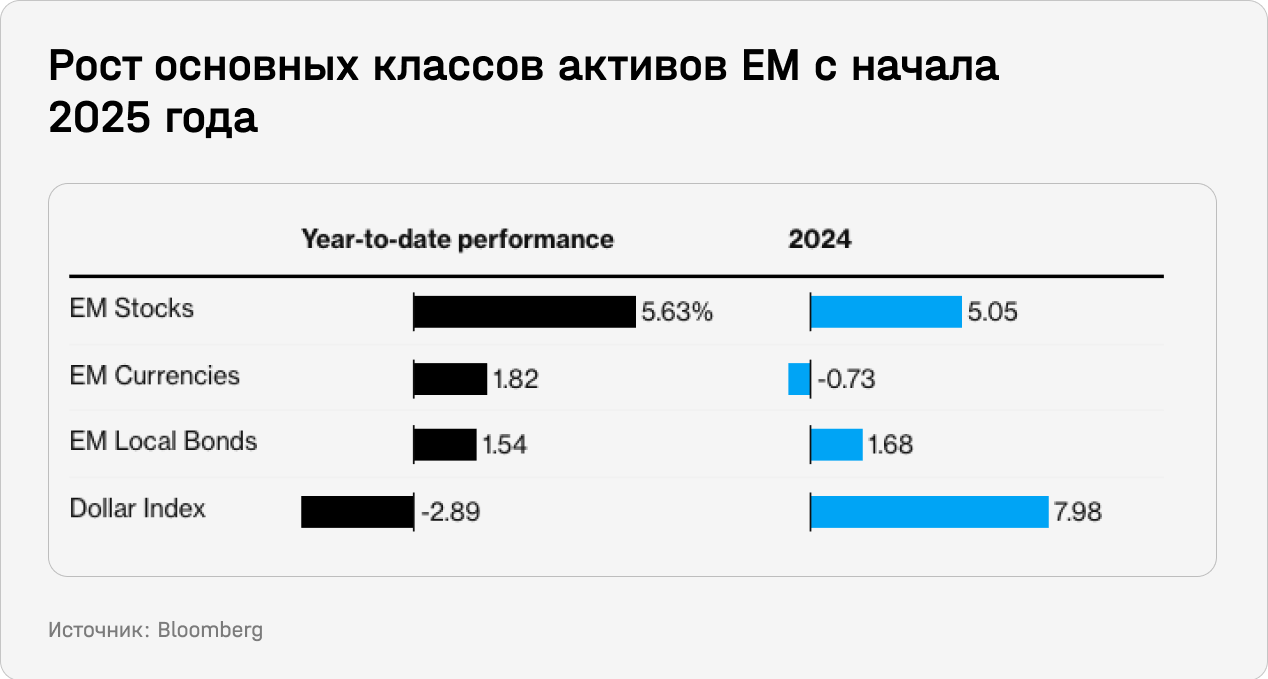 В целом индекс MSCI развивающихся рынков (EM) с начала года вырос на 7,9%, S&P 500 упал на 3,8%. Инвесторы продолжают скупать не только акции развивающихся стран, но и другие активы, указывает Bloomberg. Ослабление доллара помогло поднять индекс местных валют и гособлигаций.