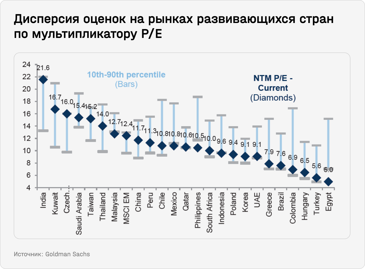 Индекс MSCI EM сейчас торгуется с форвардным коэффициентом P/E на уровне 12,4 — это на 0,7 стандартного отклонения выше 20-летнего среднего. Однако многие рынки остаются существенно недооцененными, создавая для глобальных инвесторов возможность диверсифицировать портфель благодаря низкой корреляции с S&P 500 (за исключением Индии).