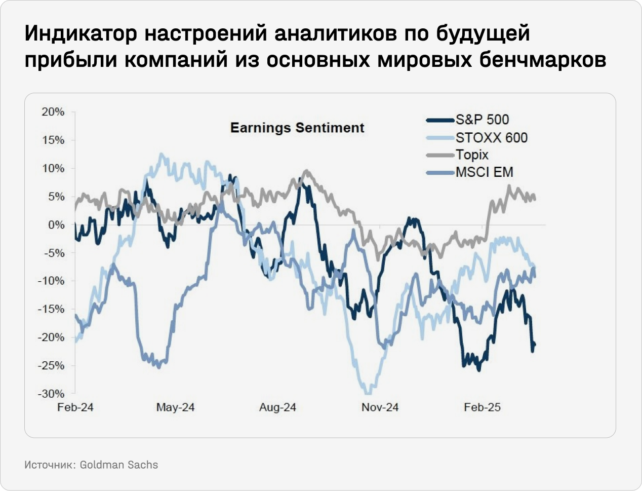 Индикатор настроений аналитиков по будущей прибыли компаний (рассчитывается как разница между количеством повышений прогнозов и количеством понижений, деленная на общее число оценок за месяц) для S&P 500 оказался существенно ниже нейтрального уровня, опустившись до -20%. В то же время сентимент относительно компонентов европейского STOXX 600, японского Topix и MSCI EM выглядит значительно более «бычьим». Подпитывают этот сдвиг ожидания того, что тарифная политика президента Дональда Трампа больно ударит по американским корпоративным прибылям.