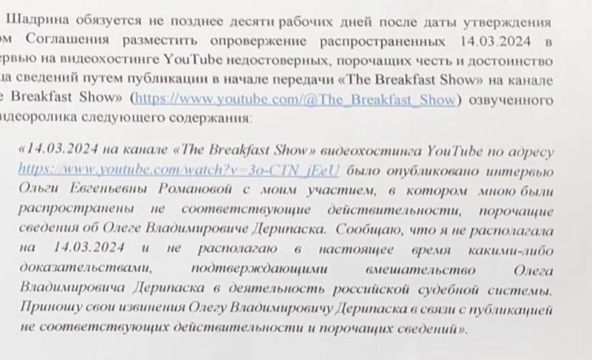 По решению суда, журналистка должна записать для The Breakfast show видео с заголовком «Опровержение сведений об О. В. Дерипаска», видео должно храниться на канале не менее двух месяцев. В ролике должно быть сказано, что Олег Дерипаска не имеет никакого влияния на российскую судебную систему.