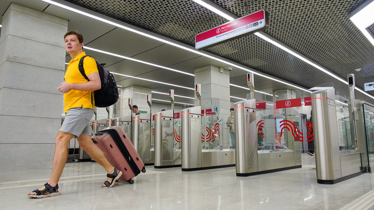 Мужчина с багажом на станции «Аэропорт Внуково» Солнцевской линии Московского метрополитена. Фото: Александр Авилов / Агентство Москва
