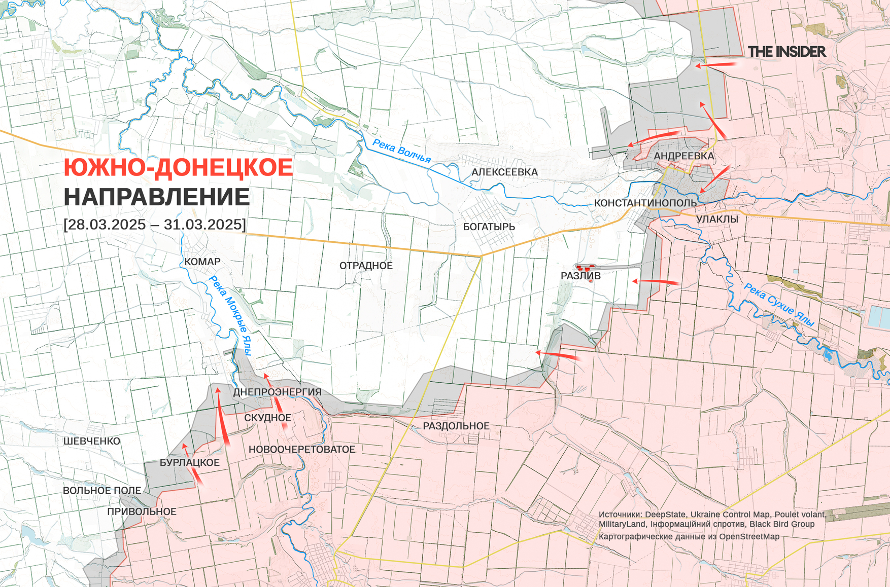 На южно-донецком направлении российские военные достигли Разлива к югу от Константинополя.