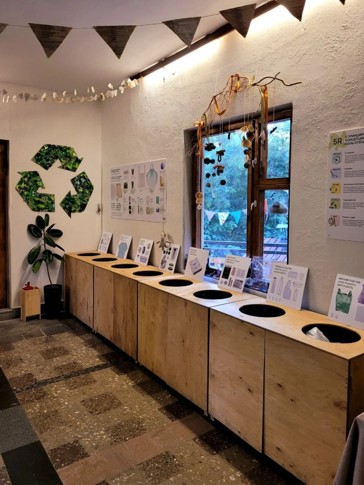 Изначально я старалась организовать все так, чтобы экоцентр стал местом, реализующим концепцию «ноль отходов». В первую очередь мы стараемся отказаться от ненужного. Тут мы говорим про отказ от ненужных покупок, про замену одноразовых вещей многоразовыми. К примеру, те же пресловутые пакеты на кассе. Если мы не можем полностью от них оказаться, мы постараемся хотя бы сократить их количество, носить с собой рюкзак, шопер или что-то еще. Дальше мы говорим про reuse: то есть если у нас что-то сломалось, мы пробуем это починить или дать вещи вторую жизнь, культура шеринга. Потом идет переработка и компостирование. Все эти пункты мы представили в нашем экоцентре.
