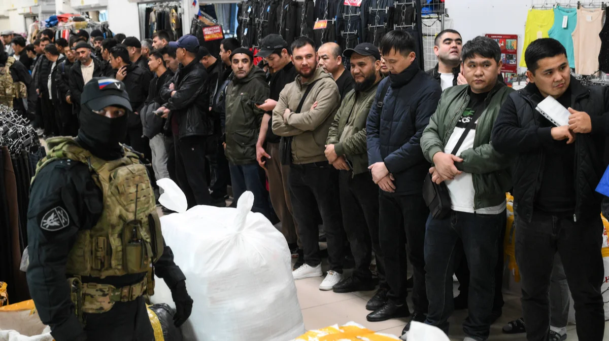 Силовики во время рейда по выявлению нарушений правил воинского учёта и незаконной миграции в Новосибирске, 15 октября 2024 года. Фото: Александр Кряжев / Спутник / Imago Images / Scanpix / LETA