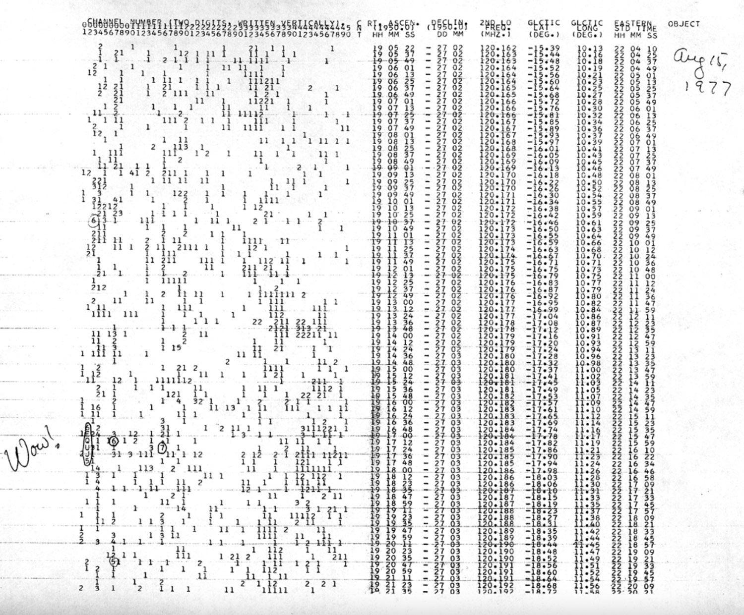 В ночь на 15 августа 1977 года астрономы, работающие на радиотелескопе Big Ear («Большое ухо»), уловили необычный сигнал из созвездия Стрельца. Исследователь, который впоследствии разбирал собранные данные и впервые заметил всплеск, сразу же обвел его и прокомментировал единственным словом — «Вау!». Так лапидарно он выразил свои эмоции от того, насколько четким и неожиданным был сигнал. «Вау!» оказался в 30 раз сильнее космического фонового шума, но, главное, пришел на частоте водородной линии — в точности как предсказывали Моррисон, Дрейк и другие основатели SETI.