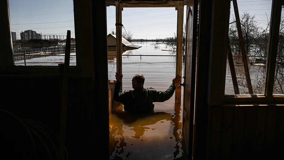 Местный житель на крыльце своего затопленного дома в Оренбурге, Россия, 11 апреля 2024 года. Фото: Владимир Астапкович / IMAGO / Scanpix / LETA