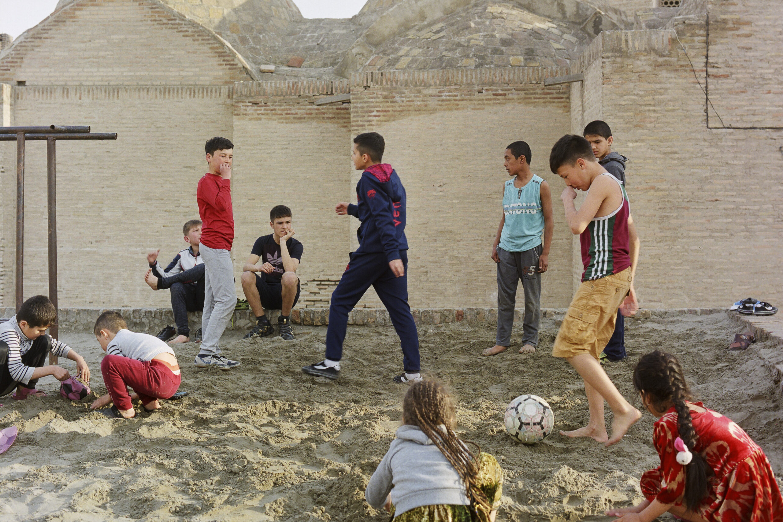 Фото: Дети играют в футбол в Бухаре на фоне старого базара Токи Заргарон. Eric Broncard / Hans Lucas via Reuters Connect