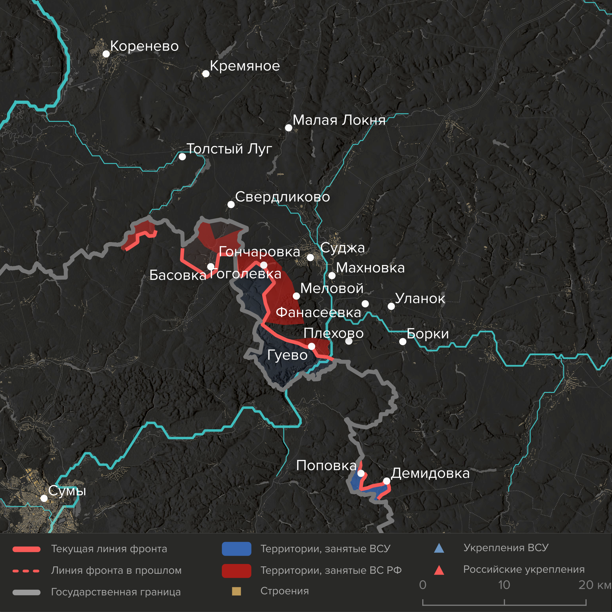 - ВСУ пытаются отвлечь российские силы от наступления на Сумы, перейдя границу Белгородской области в 20 километрах к востоку от Гуево. Им удалось продвинуться вглубь российской территории на пару километров. Атака была остановлена в селах Поповка и Демидовка. Однако ВСУ продолжают удерживать небольшой плацдарм у границы.