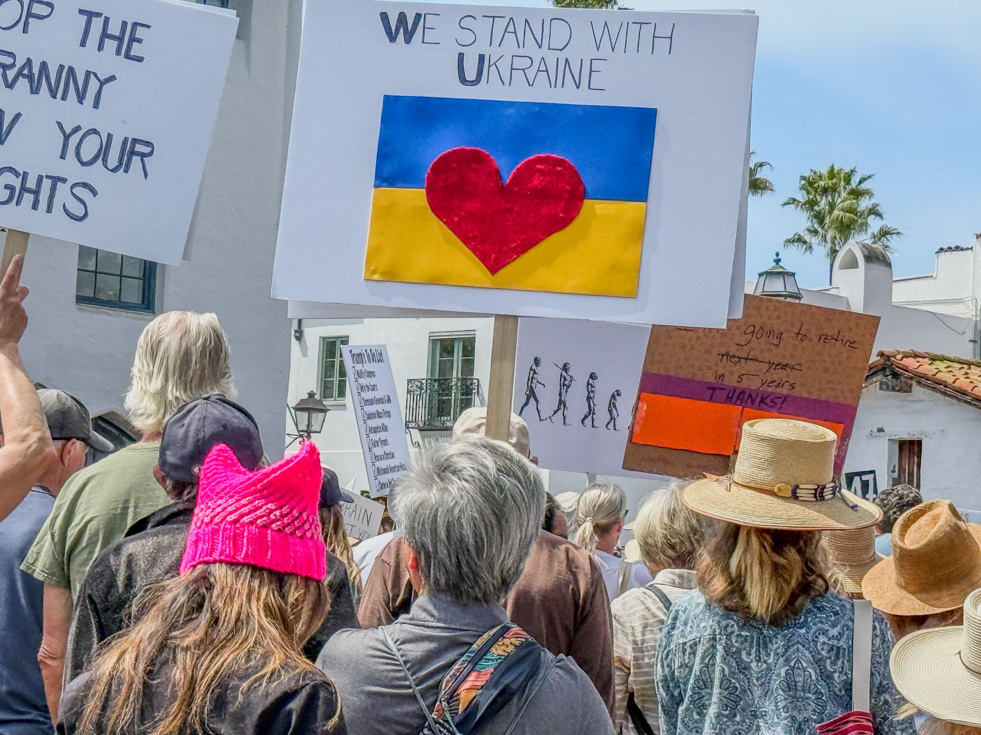 Amy Katz / ZUMA Press Wire / Scanpix / LETA Плакаты в поддержку Украины на митинге против Трампа «Руки прочь». 5 апреля 2025 года