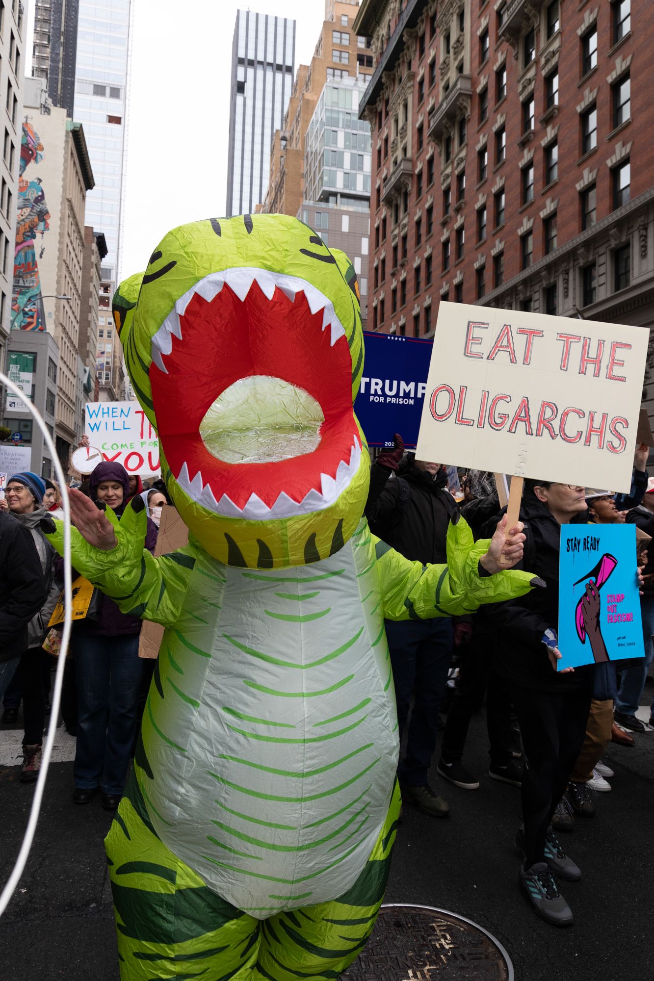 Gina M Randazzo/ ZUMA Press Wire / Scanpix / LETA Протестующий в центре Манхэттена в костюме динозавра с плакатом «Ешь олигархов». 5 апреля 2025 года