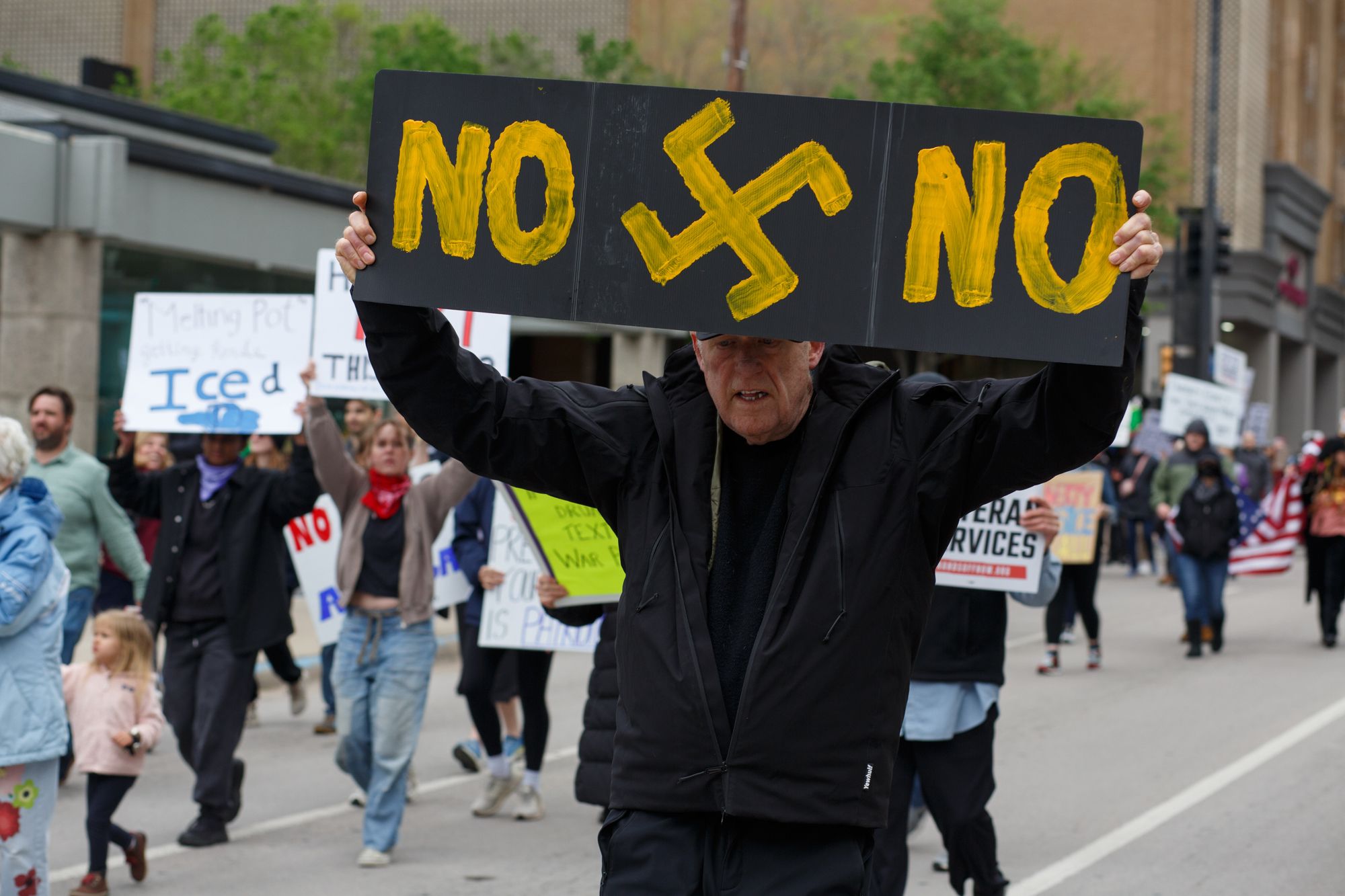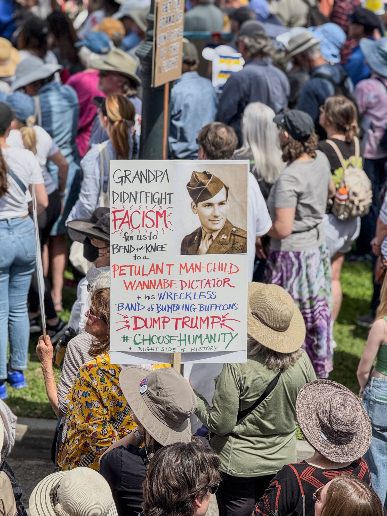 Amy Katz / ZUMA Press Wire / Scanpix / LETA Надпись на плакате: «Дедушка не для того боролся с фашизмом, чтобы мы подчинялись капризному великовозрастному ребенку, мечтающему стать диктатором». 5 апреля 2025 года