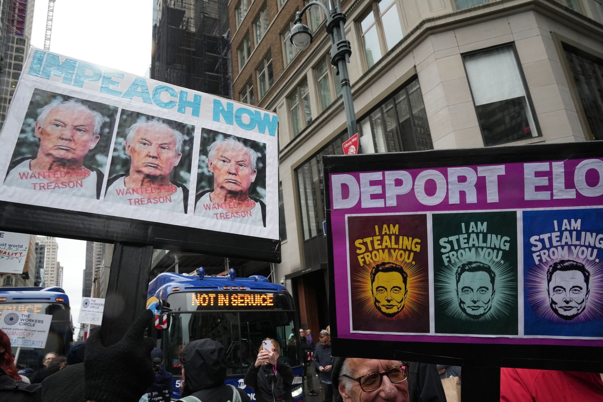 Bryan Smith / ZUMA Press Wire / Scanpix / LETA Протестующие на Пятой авеню с плакатами, призывающими к импичменту Трампа и депортации Маска. 5 апреля 2025 года
