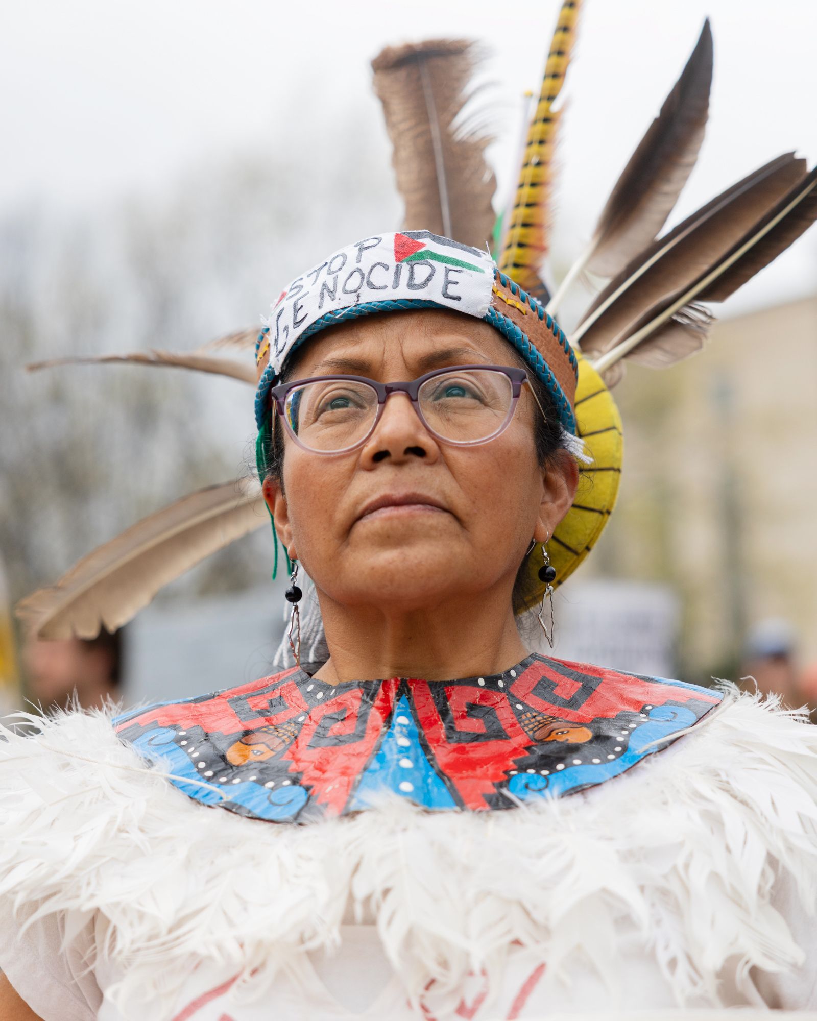 Probal Rashid / ZUMA Press Wire / Scanpix / LETA Пропалестинская активистка на акции протеста «Руки прочь!». 5 апреля 2025 года
