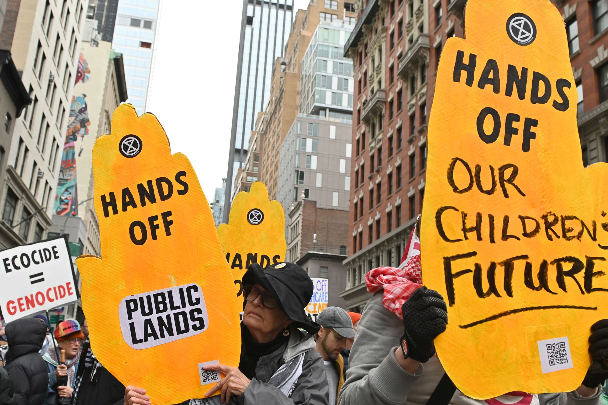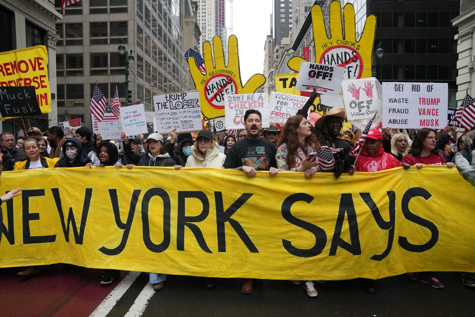 Andrea Renault / ZUMA Press Wire / Scanpix / LETA Протестующие с плакатами «Руки прочь» на Пятой авеню. 5 апреля 2025 года