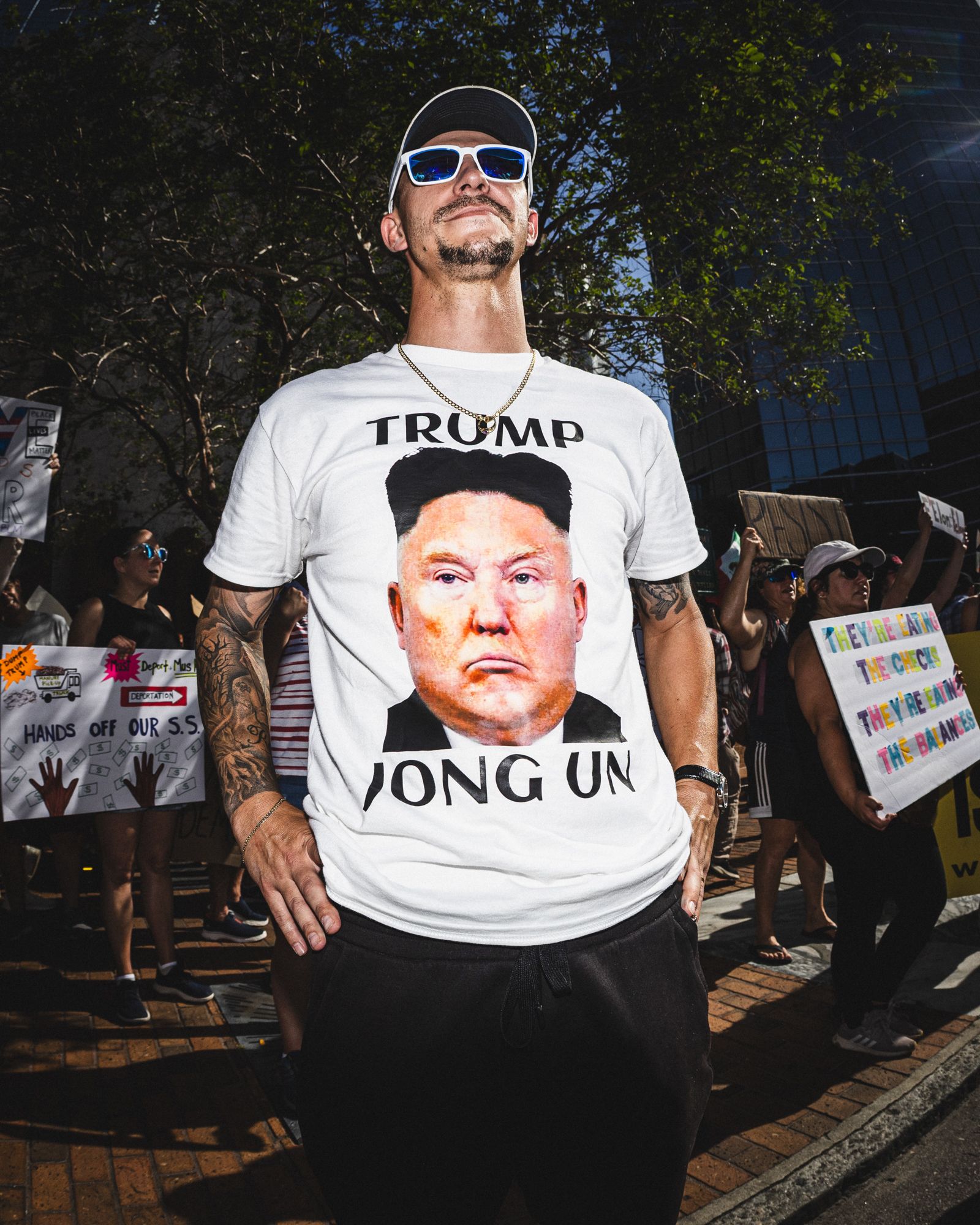 Dave Decker / ZUMA Press Wire / Scanpix / LETA Один из участников митинга в футболке с изображением Трампа в образе северокорейского лидера Ким Чен Ына. 5 апреля 2025 года